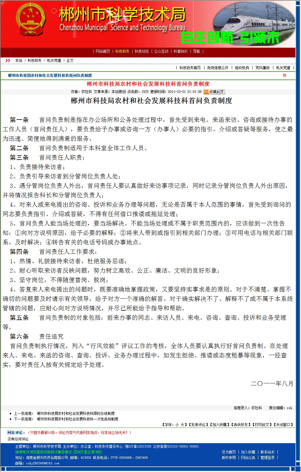 郴州市科技局农村和社会发展科技科首问负责制度