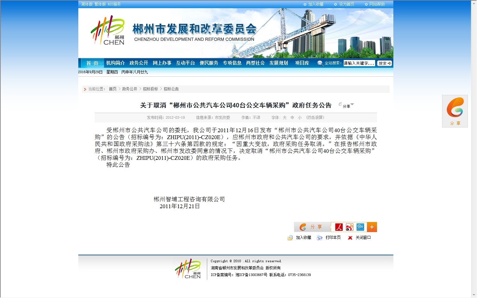 受郴州市公共汽车公司的委托,我公司于2011年12月16日发布“郴州市公共汽车公司40台公交车辆采购”的公告(招标编号为:ZHIPU(2011)-CZ020E),应郴州市政府和公共汽车公司的要求,并依据《中华人民共和国政府采购法》第三十六条第四款的规定:“因重大变故,政府采购任务取消。”在报告郴州市政府、郴州市政府采购办、郴州市发改委同意的情况下,决定取消“郴州市公共汽车公司40台公交车辆采购” (招标编号为:ZHIPU(2011)-CZ020E)的政府采购任务。