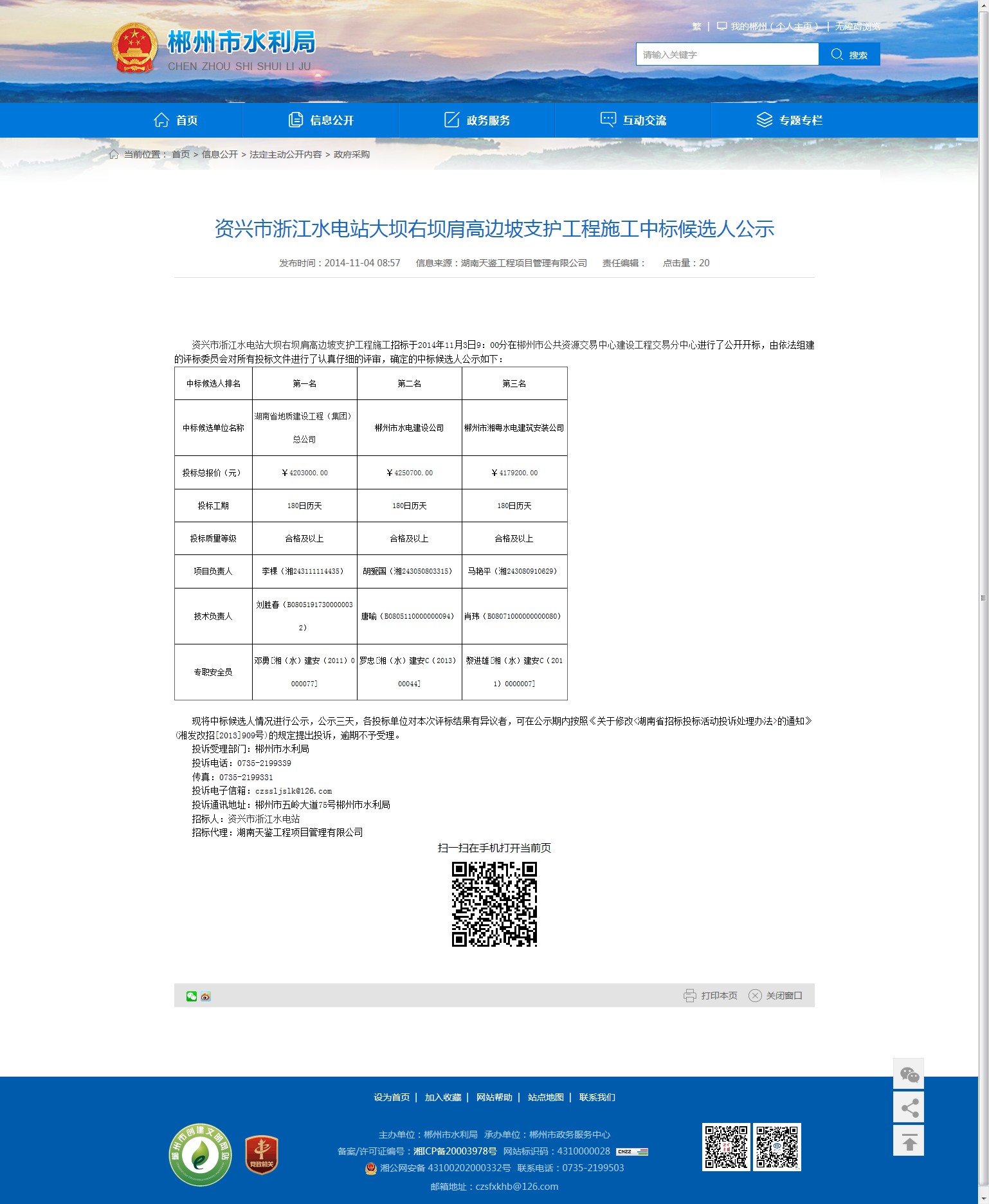 资兴市浙江水电站大坝右坝肩高边坡支护工程施工招标于2014年11月3日9:00分在郴州市公共资源交易中心建设工程交易分中心进行了公开开标,由依法组建的评标委员会对所有投标文件进行了认真仔细的评审,确定的中标候选人公示如下: