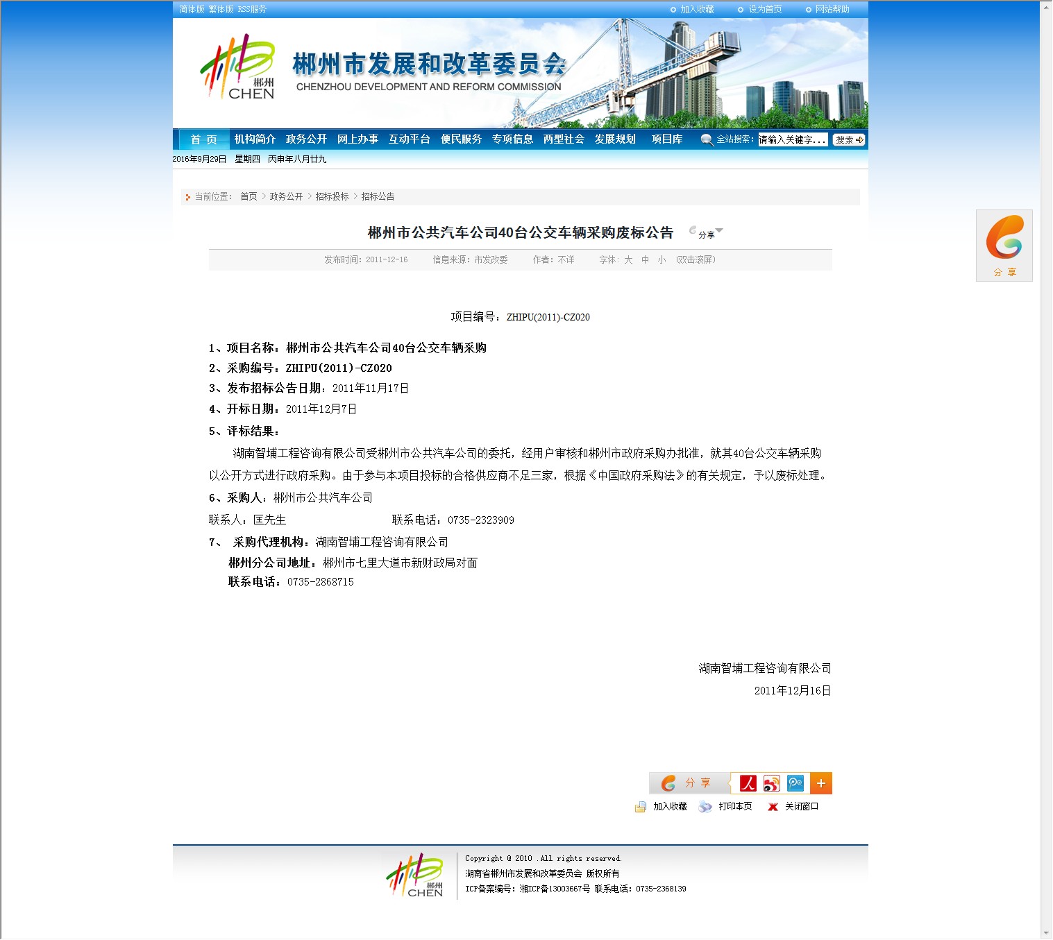 湖南智埔工程咨询有限公司受郴州市公共汽车公司的委托,经用户审核和郴州市政府采购办批准,就其40台公交车辆采购以公开方式进行政府采购。由于参与本项目投标的合格供应商不足三家,根据《中国政府采购法》的有关规定,予以废标处理。