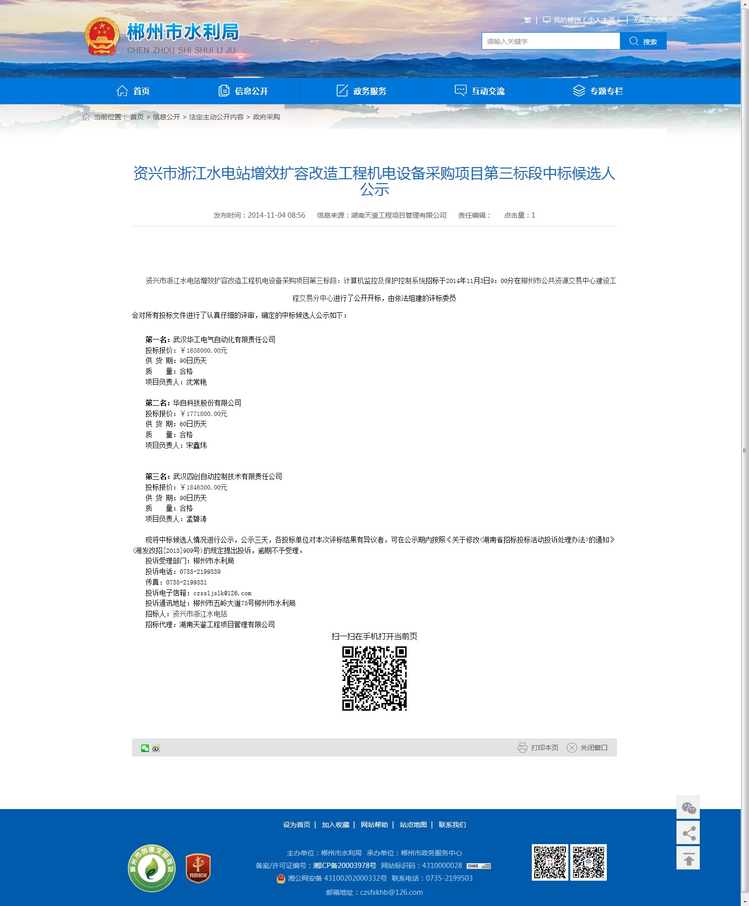 现将中标候选人情况进行公示,公示三天,各投标单位对本次评标结果有异议者,可在公示期内按照《关于修改<湖南省招标投标活动投诉处理办法>的通知》(湘发改招[2013]909号)的规定提出投诉,逾期不予受理。
