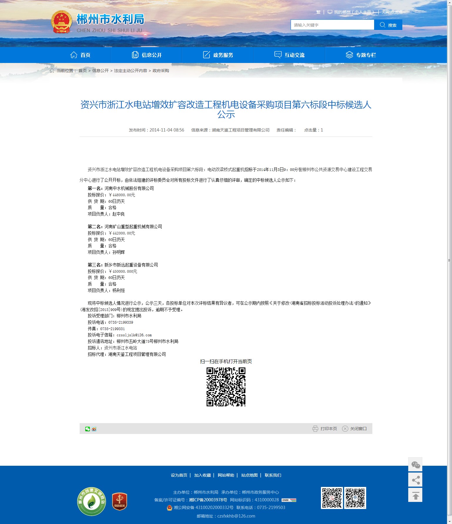 投诉受理部门:郴州市水利局