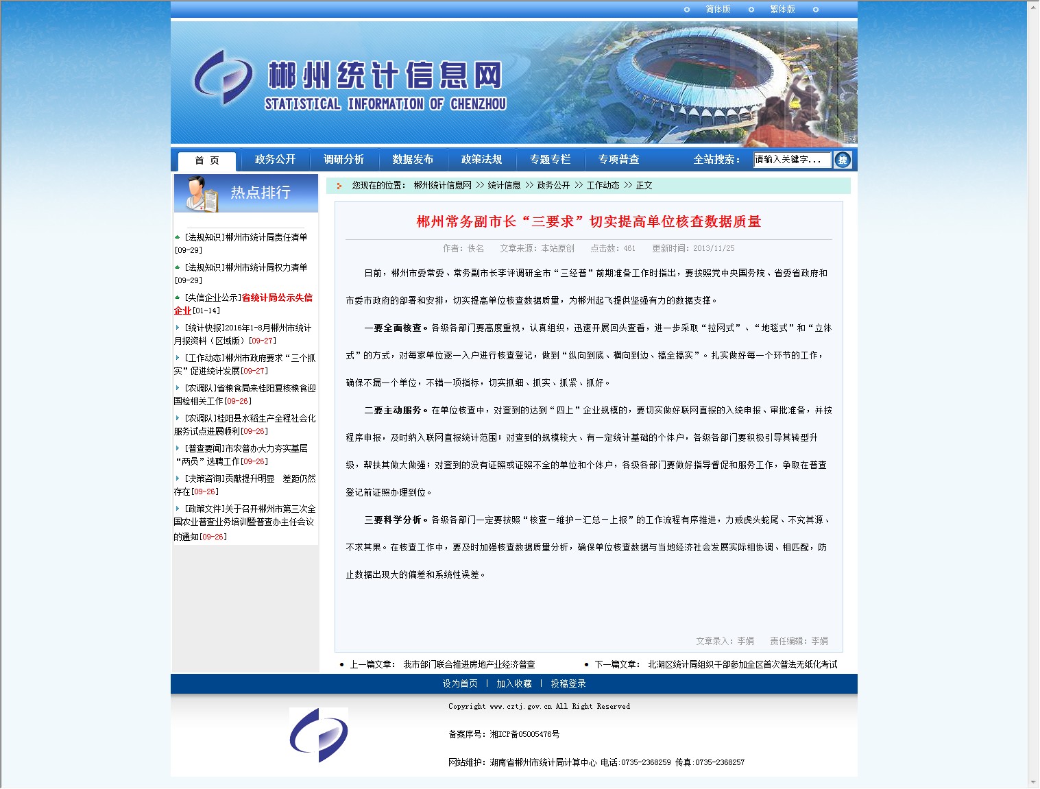 日前,郴州市委常委、常务副市长李评调研全市“三经普”前期准备工作时指出,要按照党中央国务院、省委省政府和市委市政府的部署和安排,切实提高单位核查数据质量,为郴州起飞提供坚强有力的数据支撑。