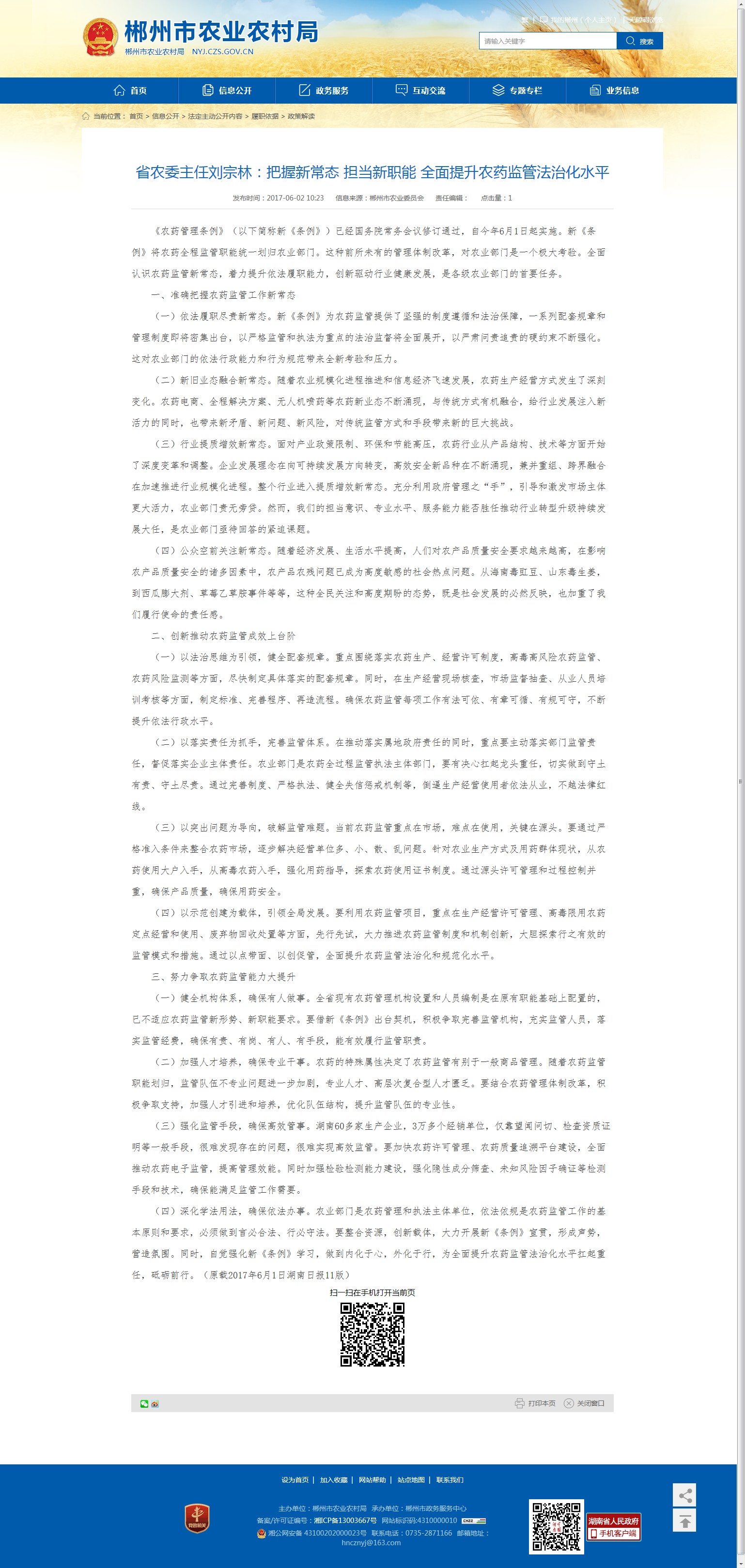 (四)深化学法用法,确保依法办事。农业部门是农药管理和执法主体单位,依法依规是农药监管工作的基本原则和要求,必须做到言必合法、行必守法。要整合资源,创新载体,大力开展新《条例》宣贯,形成声势,营造氛围。同时,自觉强化新《条例》学习,做到内化于心,外化于行,为全面提升农药监管法治化水平扛起重任,砥砺前行。(原载2017年6月1日湖南日报11版)