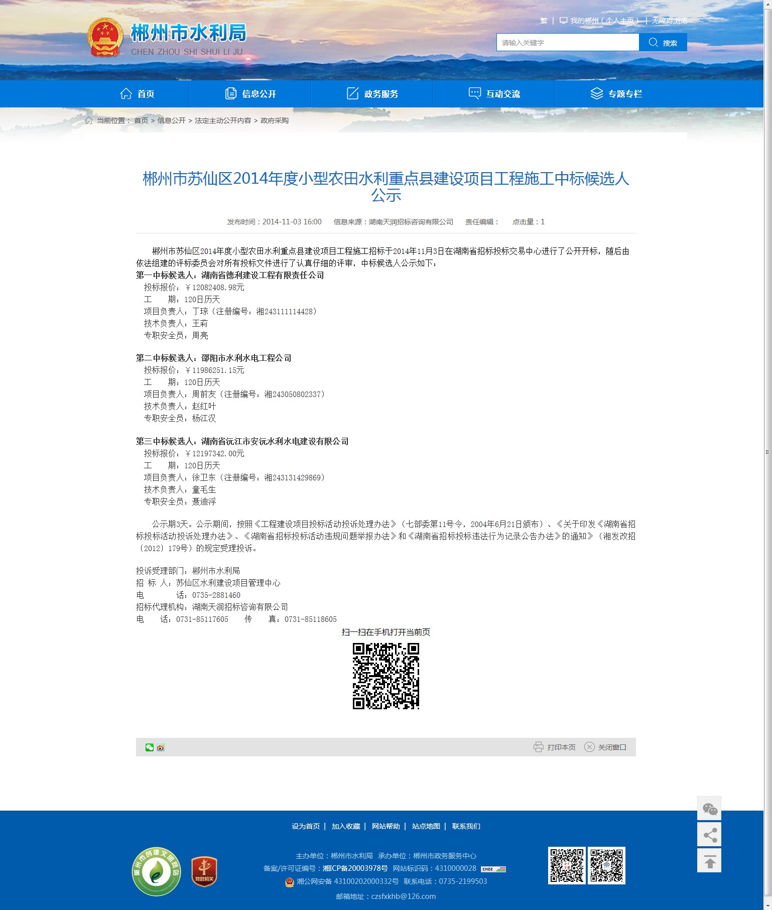 郴州市苏仙区2014年度小型农田水利重点县建设项目工程施工招标于2014年11月3日在湖南省招标投标交易中心进行了公开开标,随后由依法组建的评标委员会对所有投标文件进行了认真仔细的评审,中标候选人公示如下: