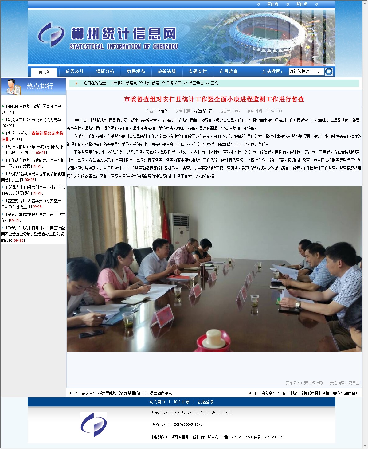 下午督查组分成2个小分队分别对永乐江镇、灵官镇、县财政局、扶贫办、农业局、林业局、畜牧水产局、发改局、经信局、商务局、住建局、房产局、工商局、安仁金砖新型建材有限公司、安仁福鑫达汽车销售服务有限公司进行了督查。督查内容主要包括统计工作保障、统计行风建设、“四上”企业部门职责、投资统计改革、1%人口抽样调查等重点工作和全面小康进程监测、民生工程统计、GDP核算基础指标等统计数据质量;督查方式主要采取听汇报、查资料、看现场等方式。这次是市政府连续第4年开展统计工作督查,督查情况将继续作为年终对各县市区和市直及中省驻郴单位综合绩效评估及统计业务工作考核的扣分依据。