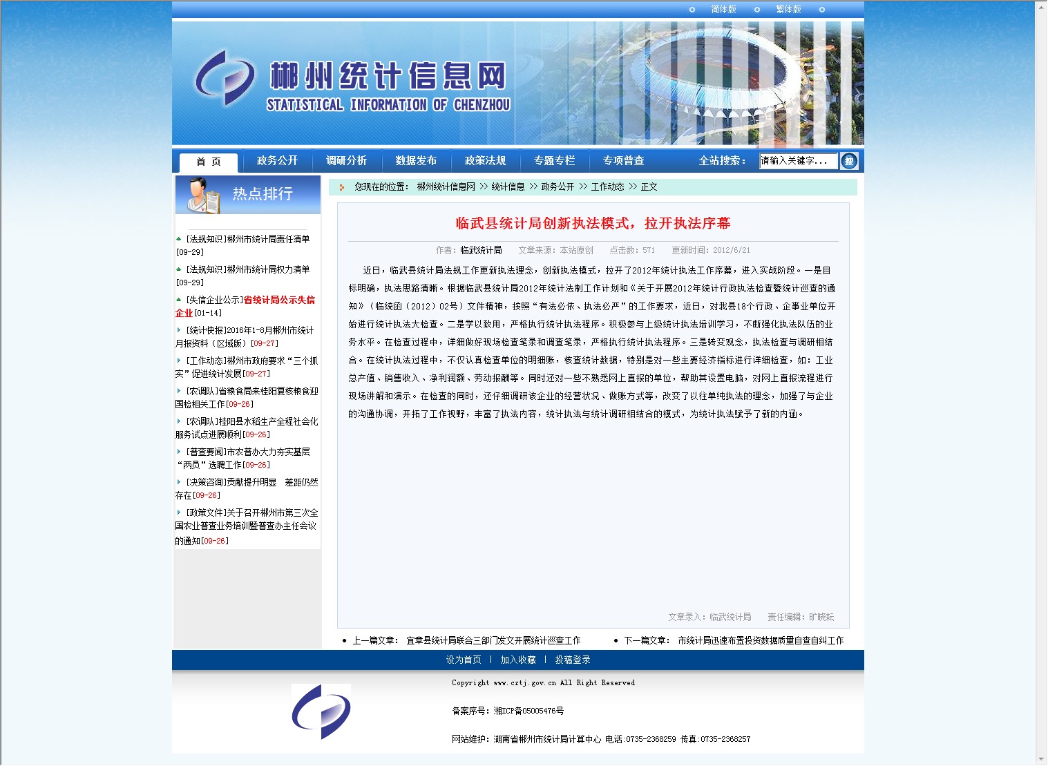 近日,临武县统计局法规工作更新执法理念,创新执法模式,拉开了2012年统计执法工作序幕,进入实战阶段。一是目标明确,执法思路清晰。根据临武县统计局2012年统计法制工作计划和《关于开展2012年统计行政执法检查暨统计巡查的通知》(临统函〔2012〕02号)文件精神,按照“有法必依、执法必严”的工作要求,近日,对我县18个行政、企事业单位开始进行统计执法大检查。二是学以致用,严格执行统计执法程序。积极参与上级统计执法培训学习,不断强化执法队伍的业务水平。在检查过程中,详细做好现场检查笔录和调查笔录,严格执行统计执法程序。三是转变观念,执法检查与调研相结合。在统计执法过程中,不仅认真检查单位的明细账,核查统计数据,特别是对一些主要经济指标进行详细检查,如:工业总产值、销售收入、净利润额、劳动报酬等。同时还对一些不熟悉网上直报的单位,帮助其设置电脑,对网上直报流程进行现场讲解和演示。在检查的同时,还仔细调研该企业的经营状况、做账方式等,改变了以往单纯执法的理念,加强了与企业的沟通协调,开拓了工作视野,丰富了执法内容,统计执法与统计调研相结合的模式,为统计执法赋予了新的内涵。
