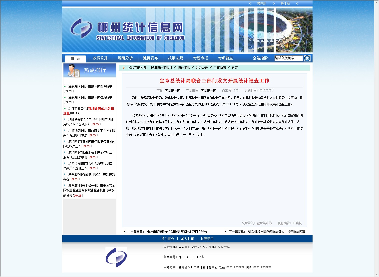 为进一步规范统计行为,强化统计监管,提高统计数据质量和统计工作水平,近日,宜章县统计局联合县人大财经委、监察局、司法局,联合发文《关于印发2012年宜章县统计巡查方案的通知》(宜统字〔2012〕14号),决定在全县范围内开展统计巡查工作。