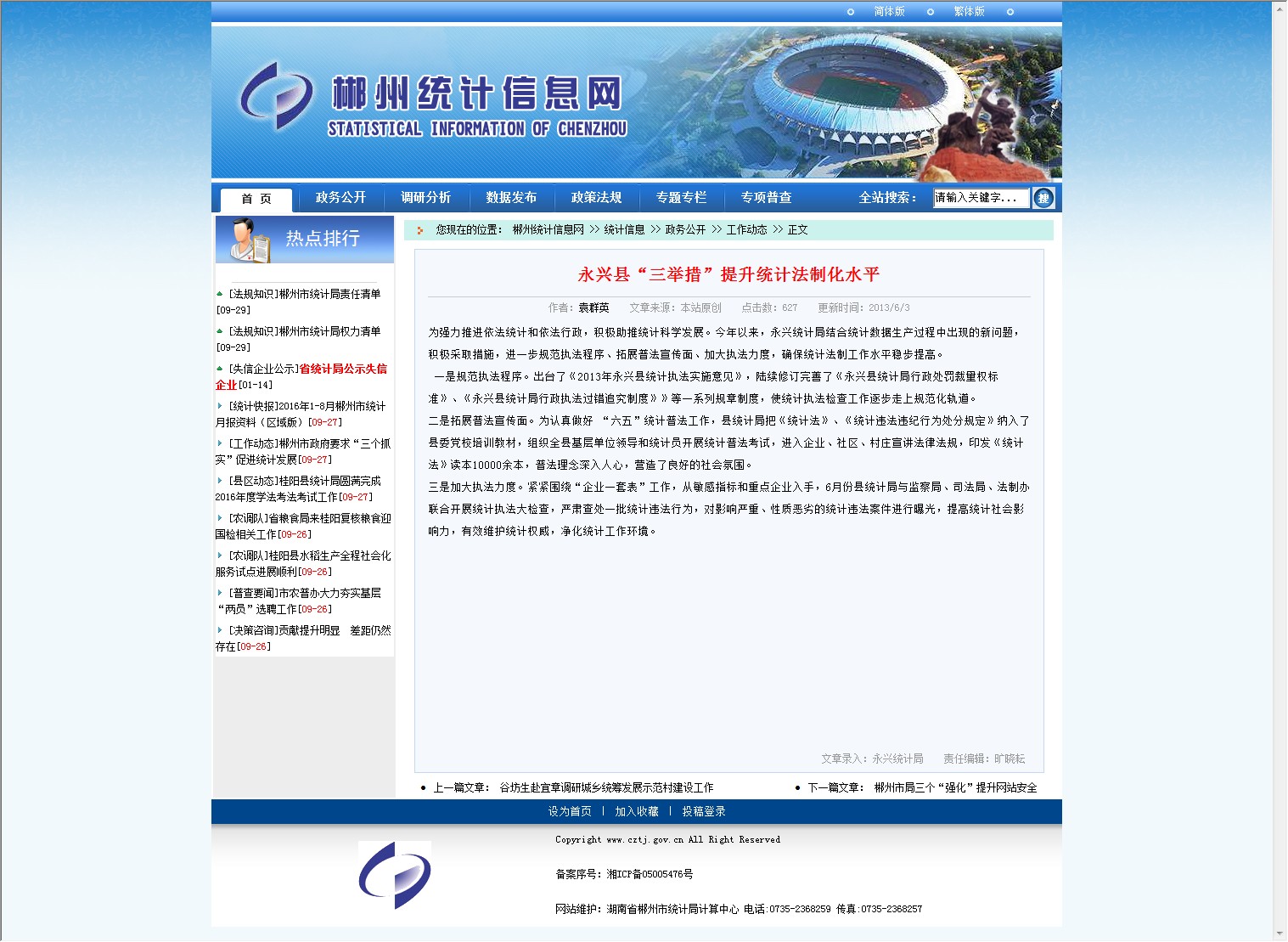 一是规范执法程序。出台了《2013年永兴县统计执法实施意见》,陆续修订完善了《永兴县统计局行政处罚裁量权标准》、《永兴县统计局行政执法过错追究制度》》等一系列规章制度,使统计执法检查工作逐步走上规范化轨道。