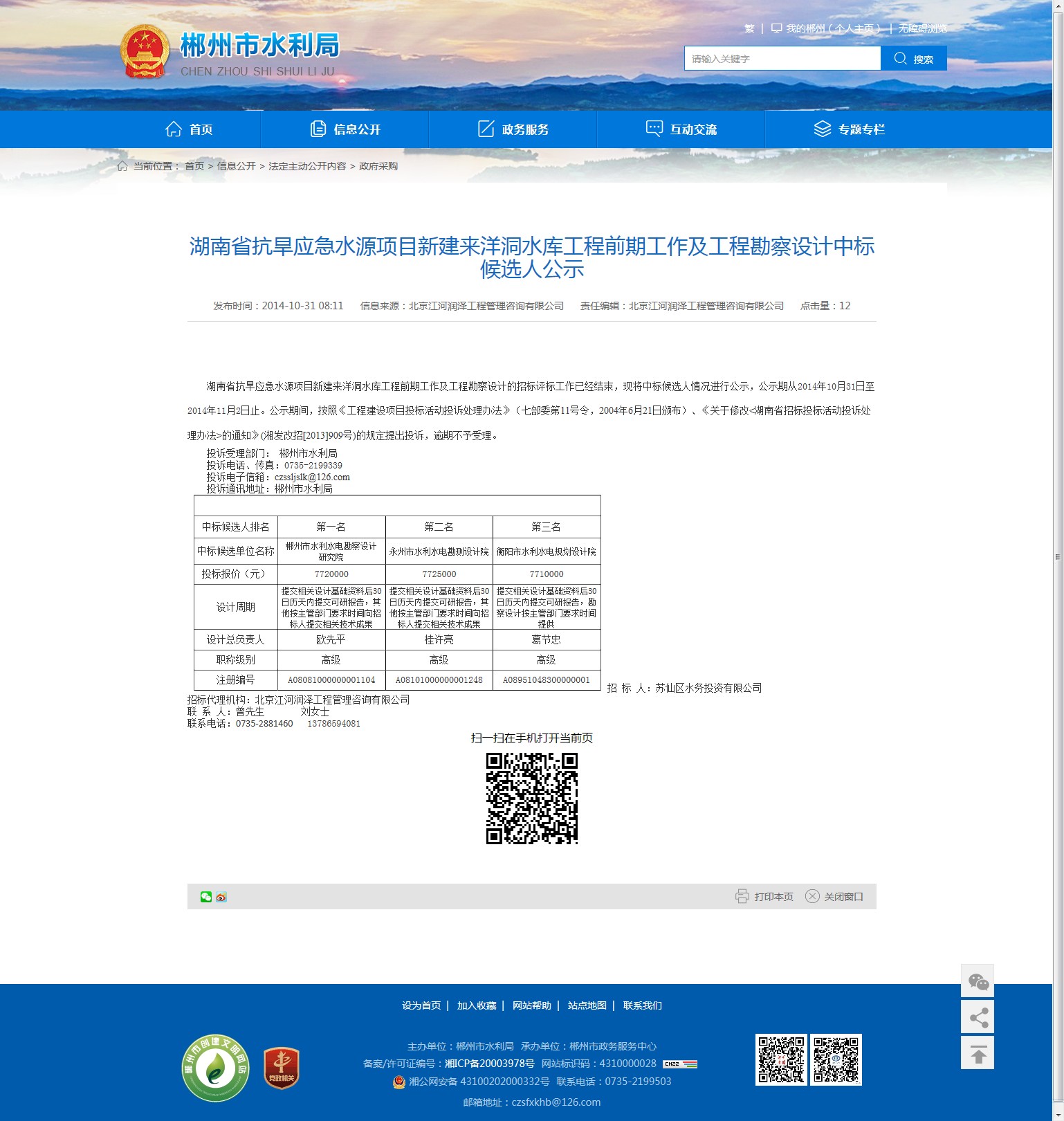 湖南省抗旱应急水源项目新建来洋洞水库工程前期工作及工程勘察设计的招标评标工作已经结束,现将中标候选人情况进行公示,公示期从2014年10月31日至2014年11月2日止。公示期间,按照《工程建设项目投标活动投诉处理办法》(七部委第11号令,2004年6月21日颁布)、《关于修改<湖南省招标投标活动投诉处理办法>的通知》(湘发改招[2013]909号)的规定提出投诉,逾期不予受理。