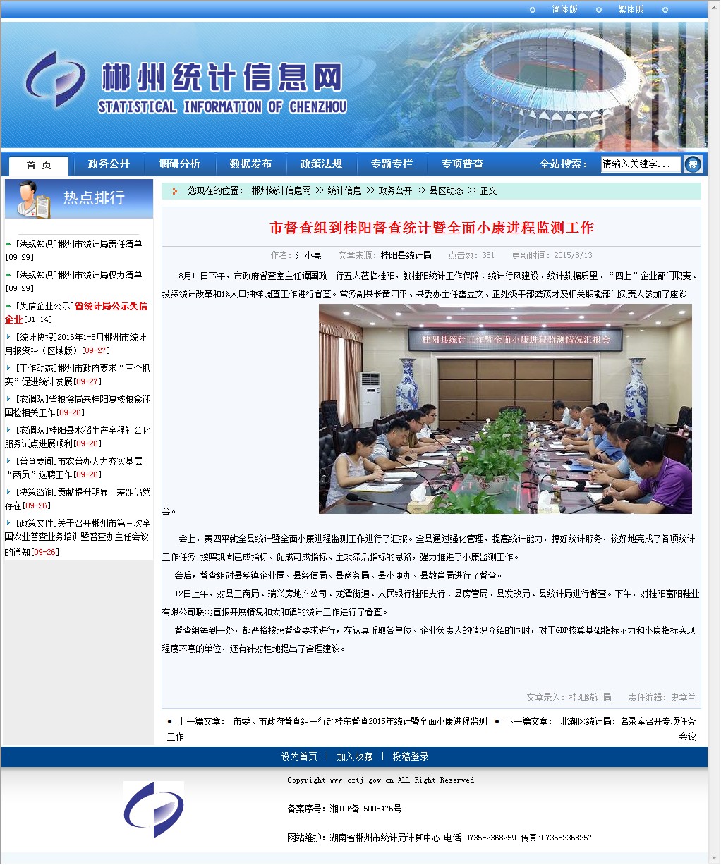 12日上午,对县工商局、瑞兴房地产公司、龙潭街道、人民银行桂阳支行、县房管局、县发改局、县统计局进行督查。下午,对桂阳富阳鞋业有限公司联网直报开展情况和太和镇的统计工作进行了督查。