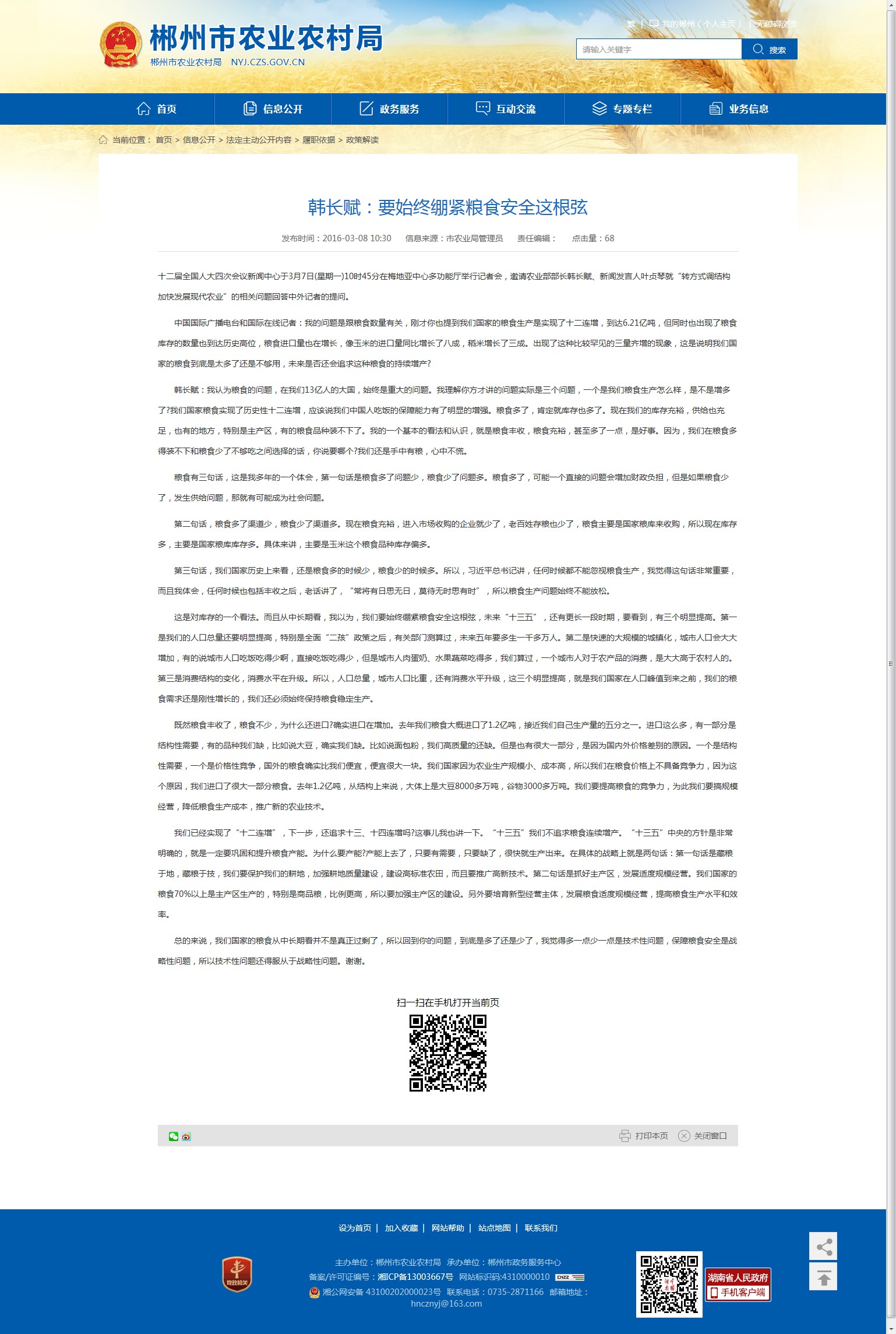 韩长赋:我认为粮食的问题,在我们13亿人的大国,始终是重大的问题。我理解你方才讲的问题实际是三个问题,一个是我们粮食生产怎么样,是不是增多了?我们国家粮食实现了历史性十二连增,应该说我们中国人吃饭的保障能力有了明显的增强。粮食多了,肯定就库存也多了。现在我们的库存充裕,供给也充足,也有的地方,特别是主产区,有的粮食品种装不下了。我的一个基本的看法和认识,就是粮食丰收,粮食充裕,甚至多了一点,是好事。因为,我们在粮食多得装不下和粮食少了不够吃之间选择的话,你说要哪个?我们还是手中有粮,心中不慌。