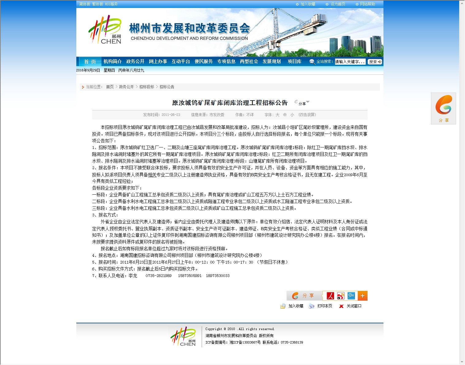 本招标项目原汝城钨矿尾矿库闭库治理工程已由汝城县发展和改革局批准建设,招标人为:汝城县小垣矿区尾砂坝管理所,建设资金来自国有投资。项目已具备招标条件,现对该项目进行公开招标。本项目分三个标段,由投标人自行选择标段报名,每个单位只能报一个标段。现将有关事项公告如下:
