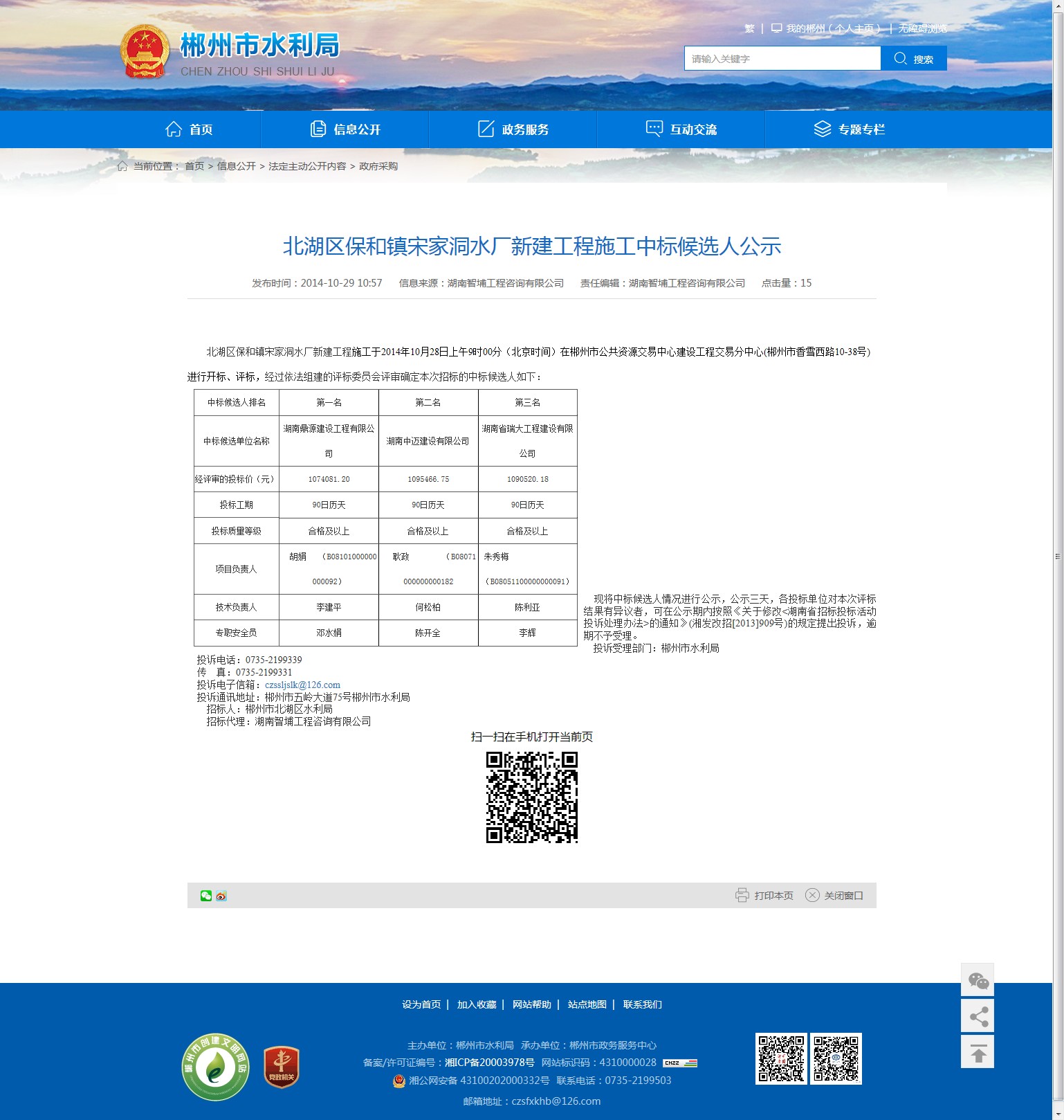 现将中标候选人情况进行公示,公示三天,各投标单位对本次评标结果有异议者,可在公示期内按照《关于修改<湖南省招标投标活动投诉处理办法>的通知》(湘发改招[2013]909号)的规定提出投诉,逾期不予受理。