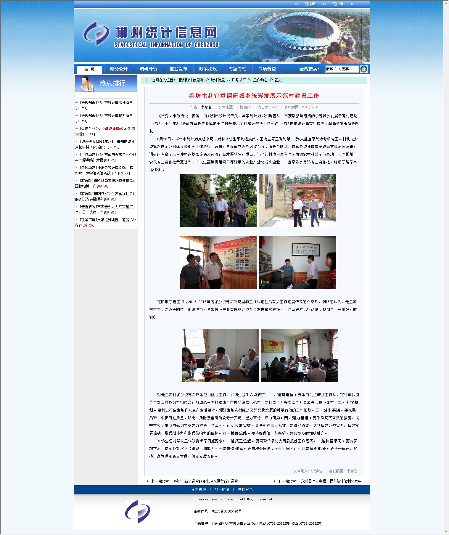 按市委、市政府统一部署,由郴州市统计局牵头,国家统计局郴州调查队、市残联参与组成的统筹城乡发展示范村建设工作队,于今年2月进驻宜章县栗源镇老王冲村开展示范村建设帮扶工作。该工作队由市统计局党组成员、副局长罗玉辉任队长。