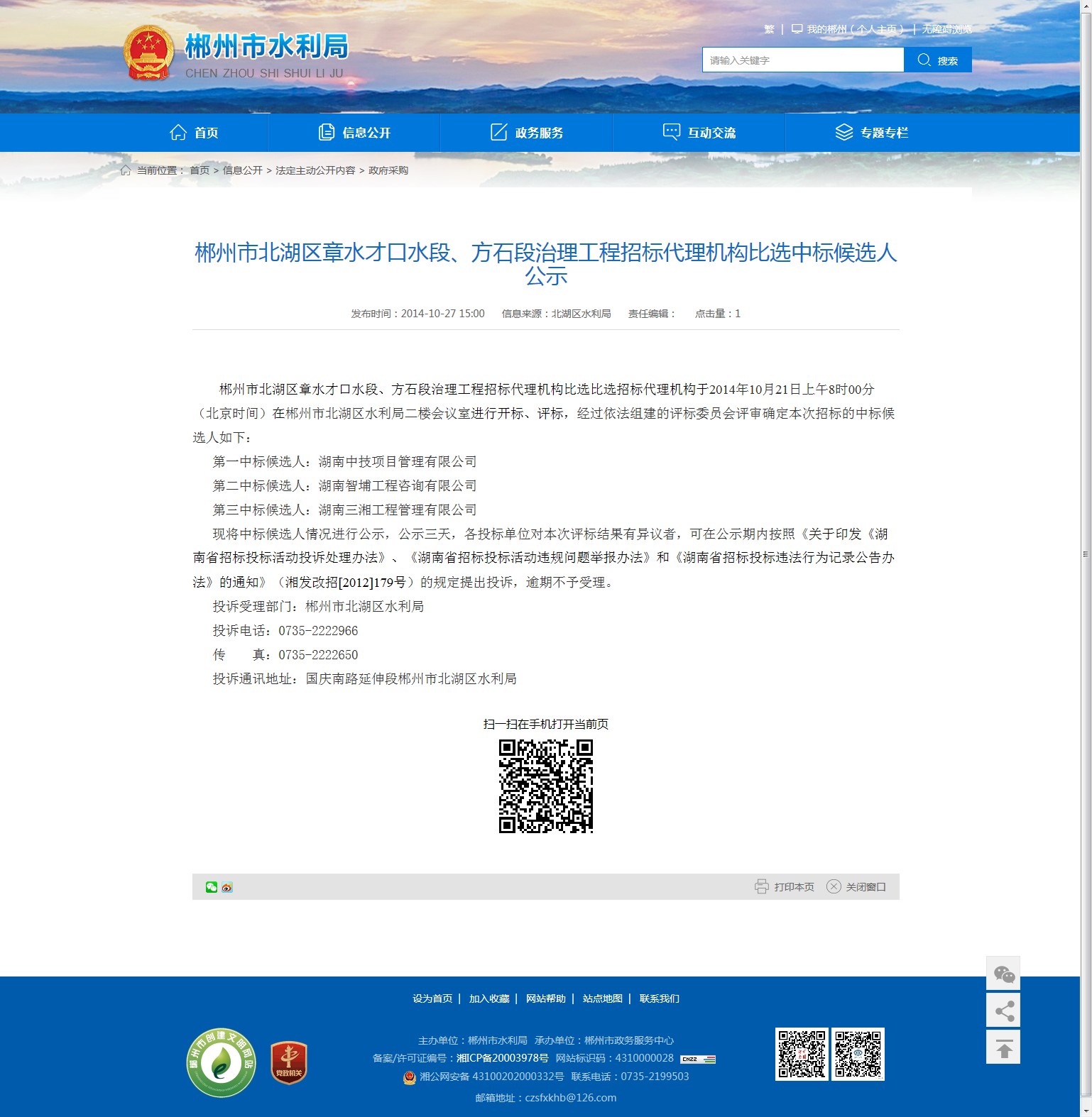 郴州市北湖区章水才口水段、方石段治理工程招标代理机构比选比选招标代理机构于2014年10月21日上午8时00分(北京时间)在郴州市北湖区水利局二楼会议室进行开标、评标,经过依法组建的评标委员会评审确定本次招标的中标候选人如下: