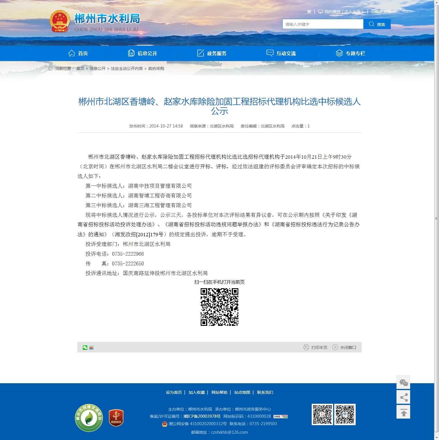 郴州市北湖区香塘岭、赵家水库除险加固工程招标代理机构比选比选招标代理机构于2014年10月21日上午9时30分(北京时间)在郴州市北湖区水利局二楼会议室进行开标、评标,经过依法组建的评标委员会评审确定本次招标的中标候选人如下: