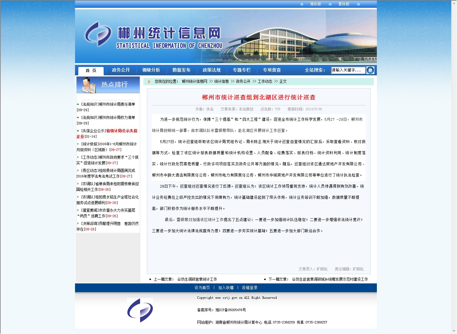 为进一步规范统计行为,保障“三个提高”和“四大工程”建设,促进全市统计工作科学发展,5月27 -28日,郴州市统计局按照统一部署,由农调队队长雷银菊带队,赴北湖区开展统计工作巡查。
