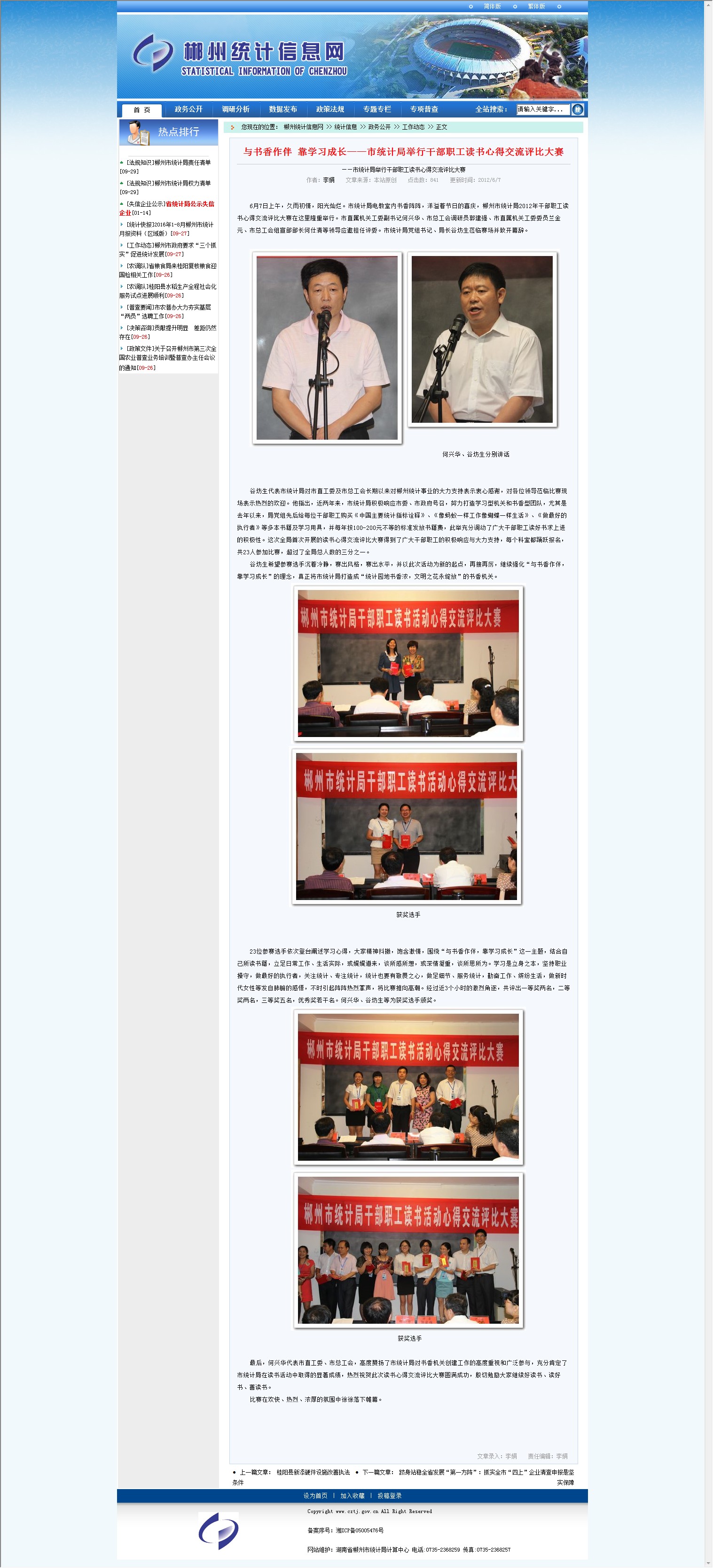谷坊生代表市统计局对市直工委及市总工会长期以来对郴州统计事业的大力支持表示衷心感谢,对各位领导莅临比赛现场表示热烈的欢迎。他指出,近两年来,市统计局积极响应市委、市政府号召,努力打造学习型机关和书香型团队,尤其是去年以来,局党组先后给每位干部职工购买《中国主要统计指标诠释》、《像蚂蚁一样工作像蝴蝶一样生活》、《做最好的执行者》等多本书籍及学习用具,并每年按100-200元不等的标准发放书籍费,此举充分调动了广大干部职工读好书求上进的积极性。这次全局首次开展的读书心得交流评比大赛得到了广大干部职工的积极响应与大力支持,每个科室都踊跃报名,共23人参加比赛,超过了全局总人数的三分之一。