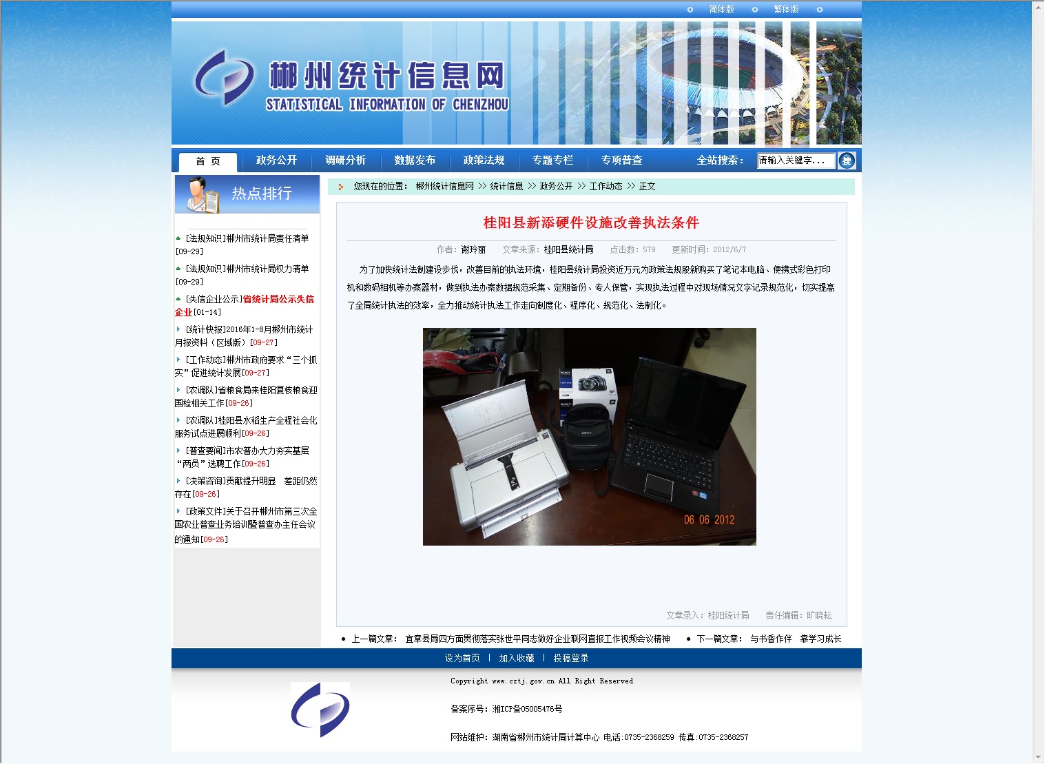 为了加快统计法制建设步伐,改善目前的执法环境,桂阳县统计局投资近万元为政策法规股新购买了笔记本电脑、便携式彩色打印机和数码相机等办案器材,做到执法办案数据规范采集、定期备份、专人保管,实现执法过程中对现场情况文字记录规范化,切实提高了全局统计执法的效率,全力推动统计执法工作走向制度化、程序化、规范化、法制化。