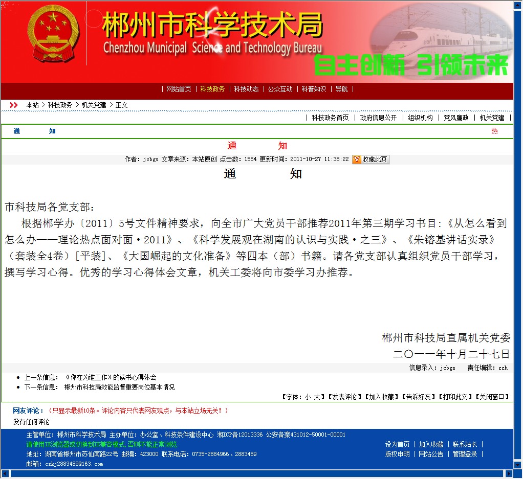 根据郴学办〔2011〕5号文件精神要求,向全市广大党员干部推荐2011年第三期学习书目:《从怎么看到怎么办——理论热点面对面·2011》、《科学发展观在湖南的认识与实践·之三》、《朱镕基讲话实录》(套装全4卷)[平装]、《大国崛起的文化准备》等四本(部)书籍。请各党支部认真组织党员干部学习,撰写学习心得。优秀的学习心得体会文章,机关工委将向市委学习办推荐。