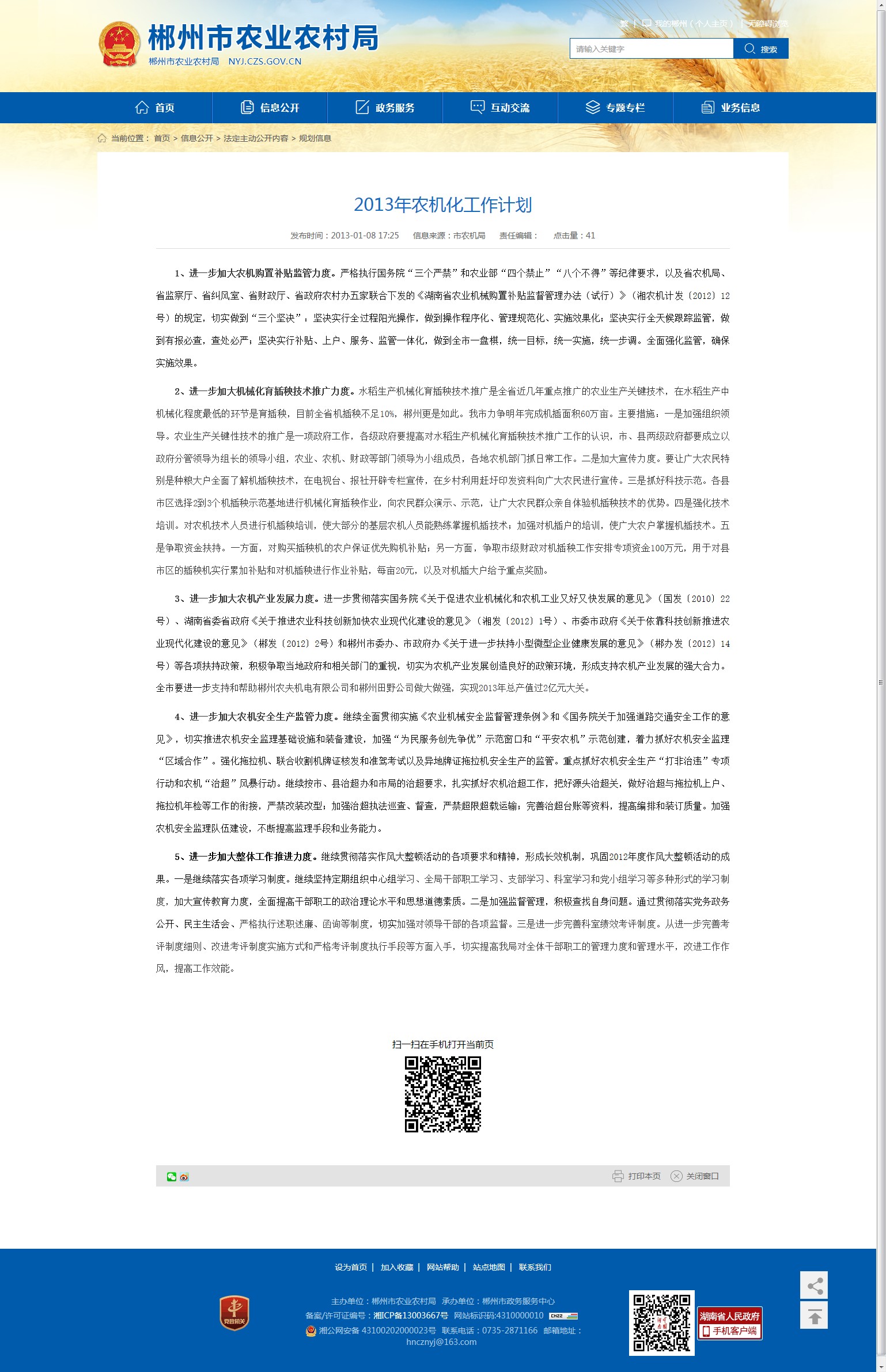 3、进一步加大农机产业发展力度。进一步贯彻落实国务院《关于促进农业机械化和农机工业又好又快发展的意见》(国发〔2010〕22号)、湖南省委省政府《关于推进农业科技创新加快农业现代化建设的意见》(湘发〔2012〕1号)、市委市政府《关于依靠科技创新推进农业现代化建设的意见》(郴发〔2012〕2号)和郴州市委办、市政府办《关于进一步扶持小型微型企业健康发展的意见》(郴办发〔2012〕14号)等各项扶持政策,积极争取当地政府和相关部门的重视,切实为农机产业发展创造良好的政策环境,形成支持农机产业发展的强大合力。全市要进一步支持和帮助郴州农夫机电有限公司和郴州田野公司做大做强,实现2013年总产值过2亿元大关。
