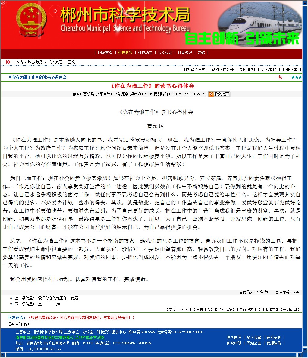 为自己而工作:现在社会的竞争极其激烈!如果在社会上立足,担起照顾父母,建立家庭,养育儿女的责任就必须得工作。工作是你让自己、家人享受美好生活的唯一途径。因此我们必须在工作中不断锻炼自己!要做到的就是有一个向上的心态。让自己永远乐观积极的面对工作。做任何事不要考虑自己会得到什么,而是考虑自己能给单位什么。这样才会发现其实自己得到的更多。不必要去计较一些小的得失。其次,就是敬业。把自己的工作当成自己的事业来做。要做好敬业就要先做好吃苦。在工作中不要怕吃苦,要知道先苦后甜。为了自己更好的成长,把在工作中的”苦”当成我们最宝贵的财富;再次,就是创新。如果万事都是听话行事,最终结果是工作把你淘汰了。所以,为了自己,必须不断学习,开发思维,创新的工作,只有让自己成为公司的财富,才能在公司面前更好的展示自己,为自己赢得更多的机会。