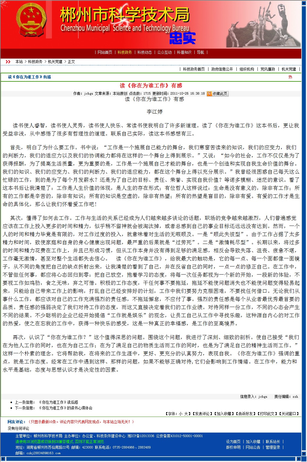 其次,懂得了如何去工作。工作与生活的关系已经成为人们越来越多谈论的话题,职场的竞争越来越激烈,人们普遍感觉应该在工作上投入更多的时间和精力,似乎稍不留神就会被淘汰掉,或者总感到自己的事业目标还远远没有达到。然而,一个人的时间和精力毕竟是有限的,对工作过度的投入,就意味着对生活的无暇顾及。一是“顾此失彼型”。由于工作占据了太多精力和时间,致使家庭和自身的身心健康出现问题,最严重的后果就是“过劳死”。二是“激情耗尽型”。长期以来,将过多的时间和精力花费在工作上,并且已形成习惯,但从工作本身并没有得到足够的满足感,相反会导致失落、沮丧、疲惫不堪,工作毫无激情,甚至对整个生活都失去信心。 读《你在为谁工作》,给我最大的触动是,它的每一点、每一个面都像一面镜子,从不同的角度把自己的缺点折射出来,让我清楚的看到了自己,并在反省自己的同时,一点一点的修正自己。在工作中,不管做任何事,都应将心态回归到零:把自己放空,抱着学习的态度,将每一次任务都视为一个新的开始,一段新的体验,不要视工作如鸡肋,食之无味,弃之可惜。积极的工作态度,干任何事不要拖延,拖延不能使问题消失也不能使问题变得轻易起来,只能给自己带来工作上的影响,打乱自己已经安排好的计划,工作中我们要努力克服困难,不要找任何借口。无论我们从事什么工作,都应该对自己的工作充满强烈的责任感,不拖延懈怠,不应付了事。强烈的责任感是每个从业者最优秀最首要的品质。责任感的强弱决定了我们对待工作的态度,而这又直接决定着我们的工作业绩。对待同样一份工作,不同的心态会产生不同的结果。不少聪明的企业已经开始提倡“工作就是娱乐”的观念,让员工自己从工作中寻找乐趣,这种源自内心的对工作的热爱,使之在忘我的工作中,获得一种快乐的感受,这是一种真正的幸福感,是工作的至高境界。