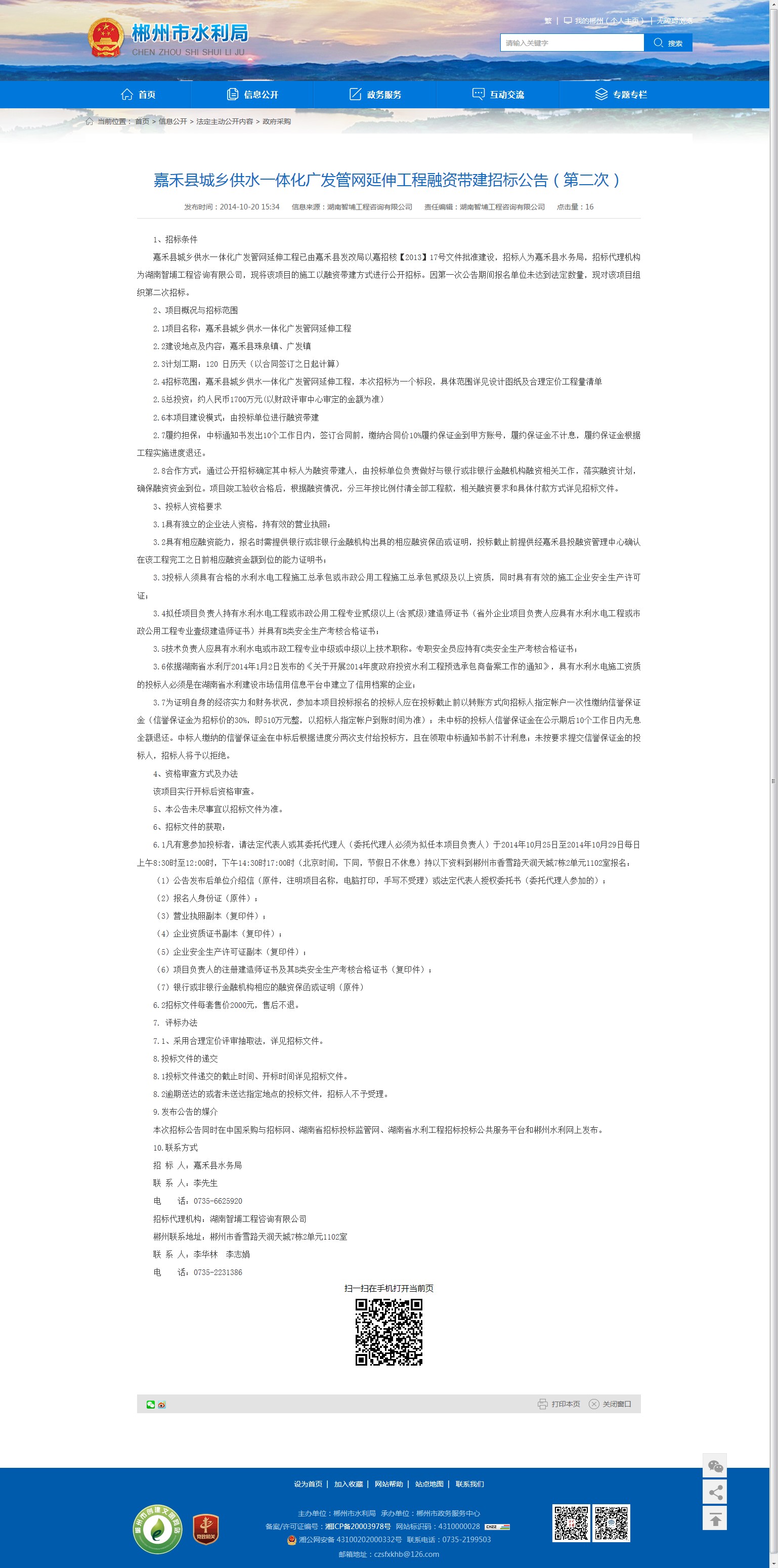 本次招标公告同时在中国采购与招标网、湖南省招标投标监管网、湖南省水利工程招标投标公共服务平台和郴州水利网上发布。