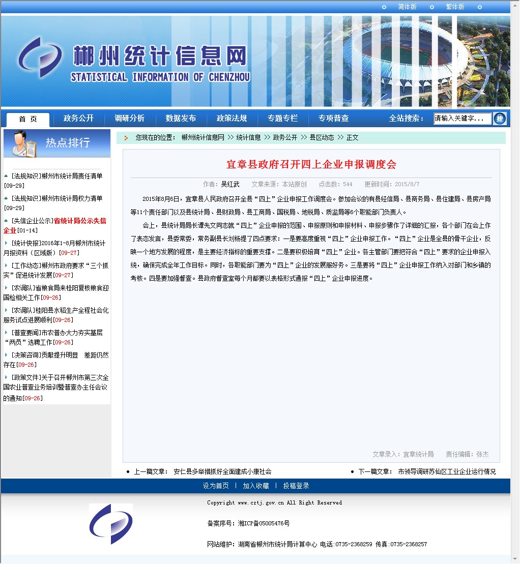 2015年8月6日,宜章县人民政府召开全县“四上”企业申报工作调度会。参加会议的有县经信局、县商务局、县住建局、县房产局等11个责任部门以及县统计局、县财政局、县工商局、国税局、地税局、质监局等6个职能部门负责人。