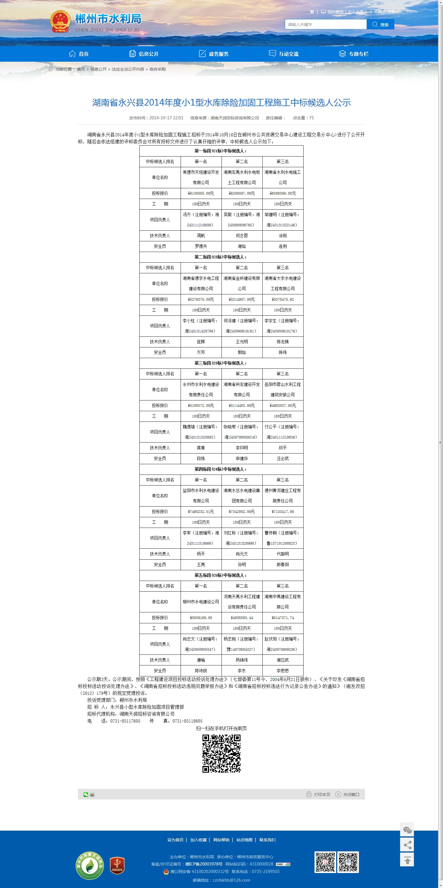 湖南省永兴县2014年度小1型水库除险加固工程施工招标于2014年10月16日在郴州市公共资源交易中心建设工程交易分中心)进行了公开开标,随后由依法组建的评标委员会对所有投标文件进行了认真仔细的评审,中标候选人公示如下: