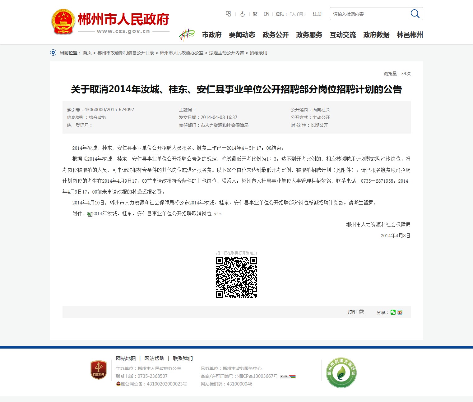 2014年4月10日,郴州市人力资源和社会保障局将公布2014年汝城、桂东、安仁县事业单位公开招聘部分岗位核减招聘计划数。请考生留意。