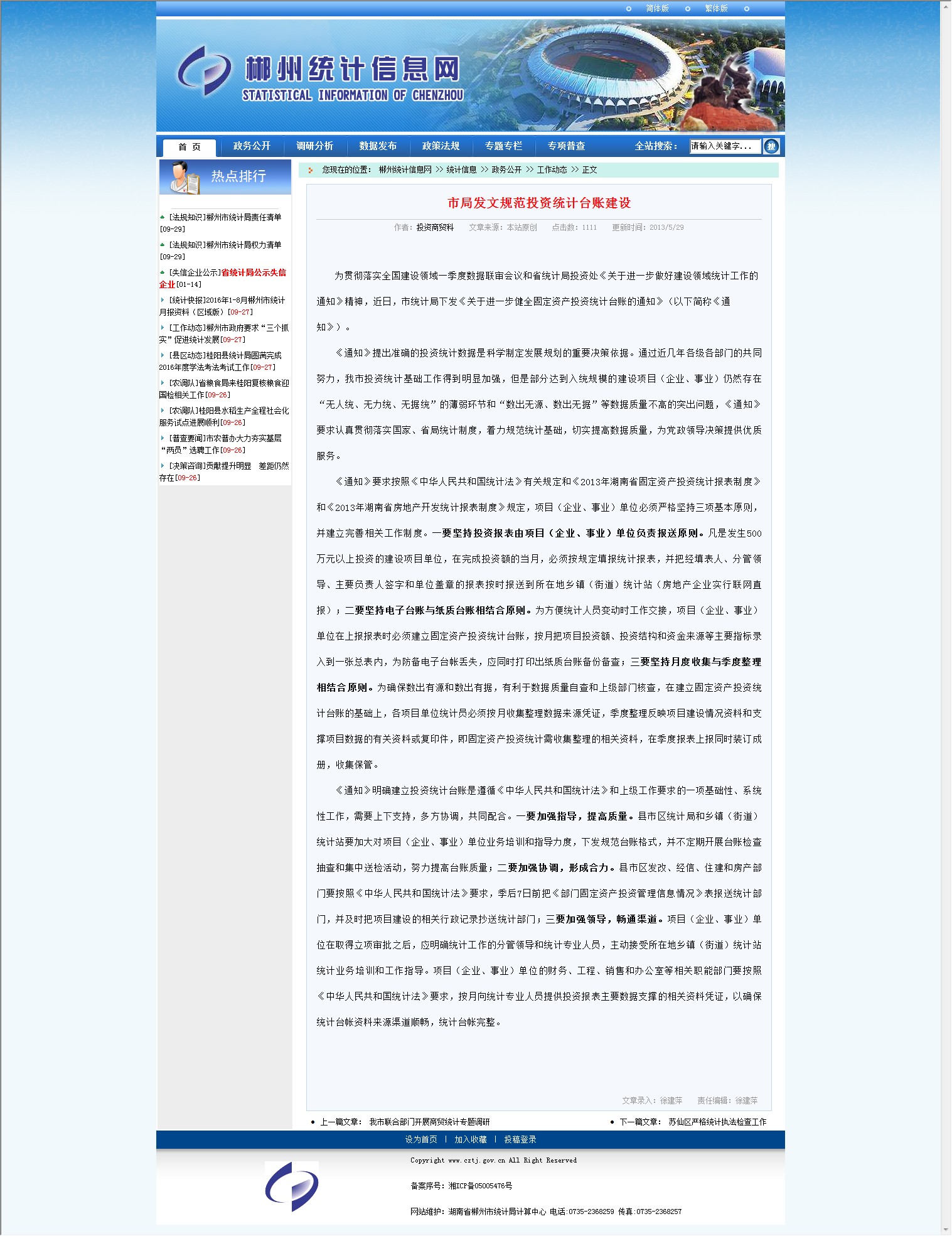 《通知》要求按照《中华人民共和国统计法》有关规定和《2013年湖南省固定资产投资统计报表制度》和《2013年湖南省房地产开发统计报表制度》规定,项目(企业、事业)单位必须严格坚持三项基本原则,并建立完善相关工作制度。一要坚持投资报表由项目(企业、事业)单位负责报送原则。凡是发生500万元以上投资的建设项目单位,在完成投资额的当月,必须按规定填报统计报表,并把经填表人、分管领导、主要负责人签字和单位盖章的报表按时报送到所在地乡镇(街道)统计站(房地产企业实行联网直报);二要坚持电子台账与纸质台账相结合原则。为方便统计人员变动时工作交接,项目(企业、事业)单位在上报报表时必须建立固定资产投资统计台账,按月把项目投资额、投资结构和资金来源等主要指标录入到一张总表内,为防备电子台帐丢失,应同时打印出纸质台账备份备查;三要坚持月度收集与季度整理相结合原则。为确保数出有源和数出有据,有利于数据质量自查和上级部门核查,在建立固定资产投资统计台账的基础上,各项目单位统计员必须按月收集整理数据来源凭证,季度整理反映项目建设情况资料和支撑项目数据的有关资料或复印件,即固定资产投资统计需收集整理的相关资料,在季度报表上报同时装订成册,收集保管。
