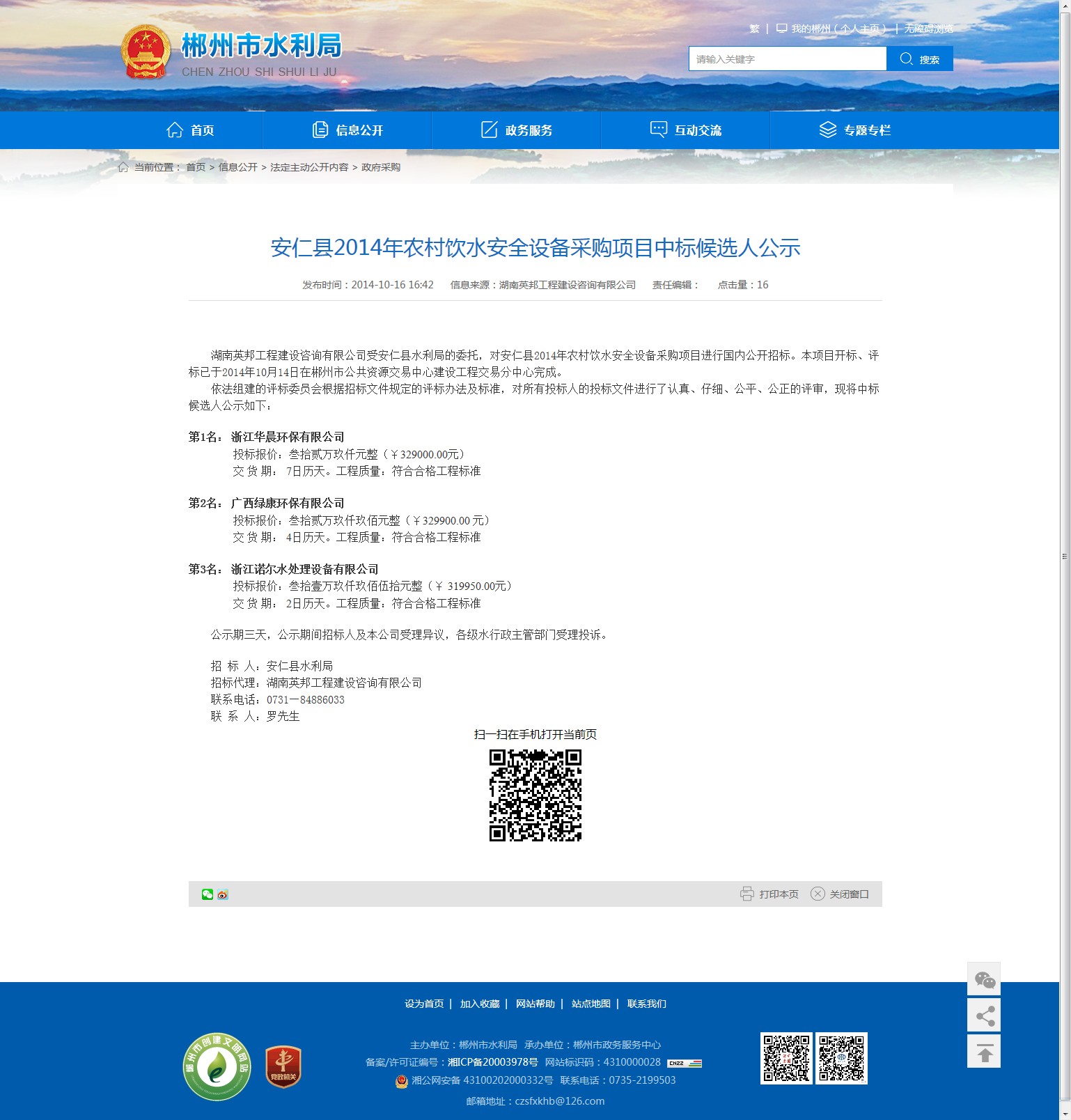 湖南英邦工程建设咨询有限公司受安仁县水利局的委托,对安仁县2014年农村饮水安全设备采购项目进行国内公开招标。本项目开标、评标已于2014年10月14日在郴州市公共资源交易中心建设工程交易分中心完成。