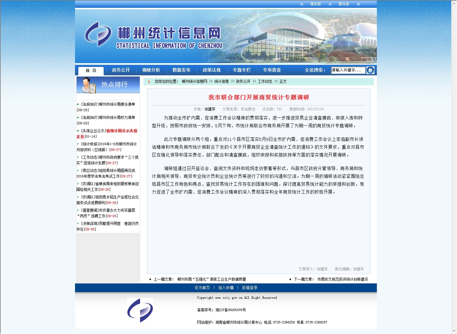 为推动全市扩内需、促消费工作会议精神的贯彻落实,进一步推进贸易企业清查摸底、申报入库和转型升级,按照市政府统一安排,5月下旬,市统计局联合市商务局开展了为期一周的商贸统计专题调研。