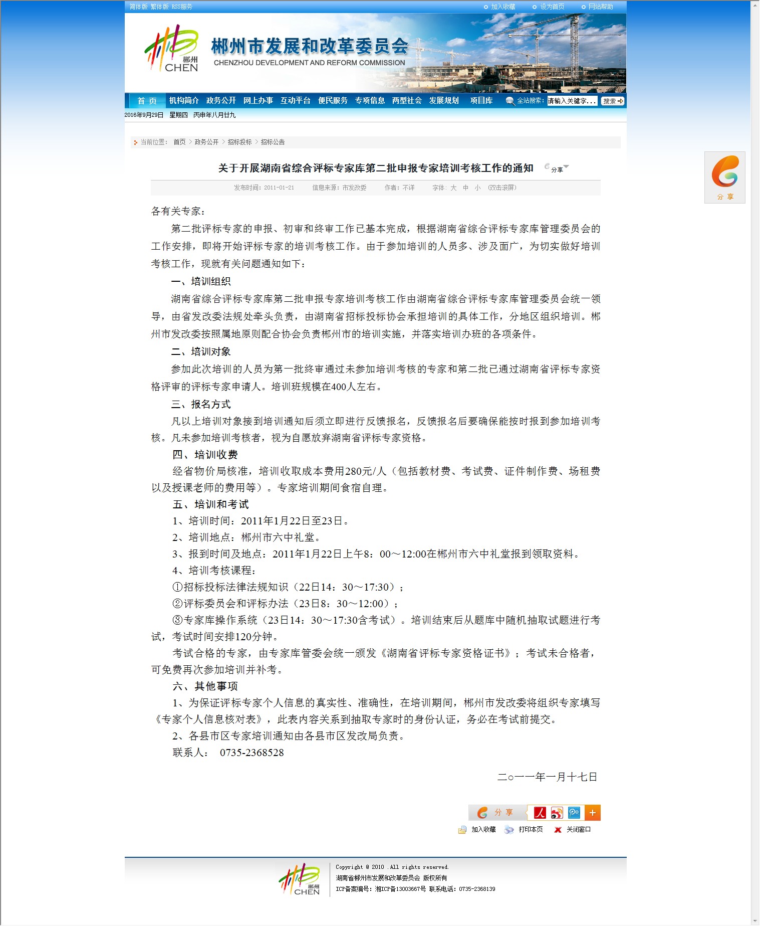 湖南省综合评标专家库第二批申报专家培训考核工作由湖南省综合评标专家库管理委员会统一领导,由省发改委法规处牵头负责,由湖南省招标投标协会承担培训的具体工作,分地区组织培训。郴州市发改委按照属地原则配合协会负责郴州市的培训实施,并落实培训办班的各项条件。