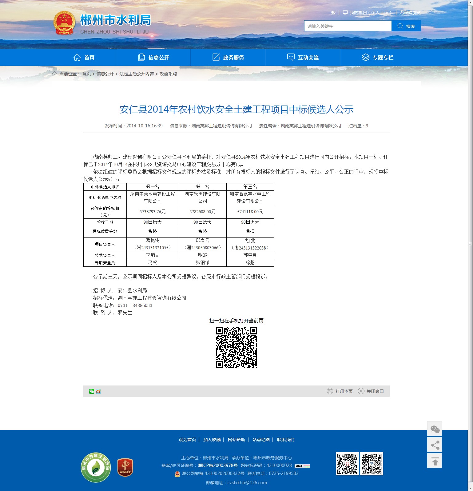 湖南英邦工程建设咨询有限公司受安仁县水利局的委托,对安仁县2014年农村饮水安全土建工程项目进行国内公开招标。本项目开标、评标已于2014年10月14在郴州市公共资源交易中心建设工程交易分中心完成。