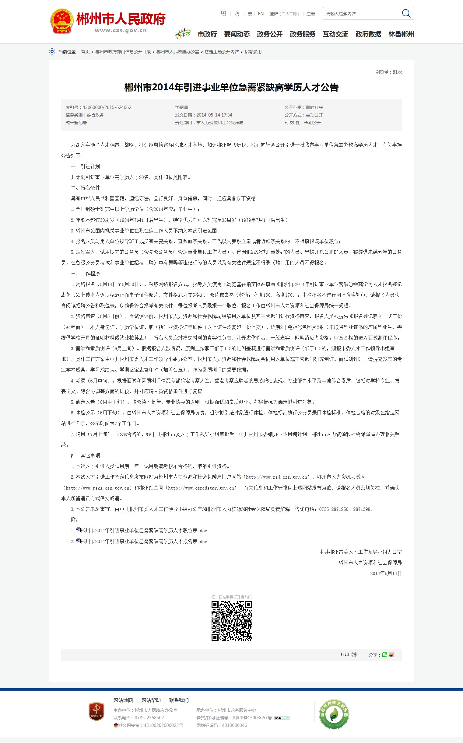 2.本次人才引进工作指定信息发布网站为郴州市人力资源和社会保障局门户网站(http://www.rsj.czs.gov.cn)、郴州市人力资源考试网(http://www.rsks.czs.gov.cn)和郴州红星网(http://www.czredstar.gov.cn),有关信息和工作安排以上述网站发布为准,请报名人员密切关注,并确认本人所留通讯方式保持畅通。
