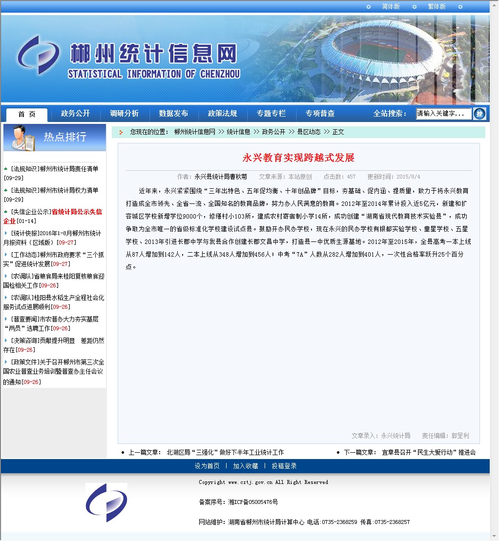 近年来,永兴紧紧围绕“三年出特色、五年促均衡、十年创品牌”目标,夯基础、促内涵、提质量,致力于将永兴教育打造成全市领先、全省一流、全国知名的教育品牌,努力办人民满意的教育。2012年至2014年累计投入近5亿元,新建和扩容城区学校新增学位9000个,修缮村小103所,建成农村寄宿制小学14所,成功创建“湖南省现代教育技术实验县”,成功争取为全市唯一的省级标准化学校建设试点县。鼓励开办民办学校,现在永兴的民办学校有银都实验学校、童星学校、五星学校、2013年引进长郡中学与我县合作创建长郡文昌中学,打造县一中优质生源基地。2012年至2015年,全县高考一本上线从87人增加到142人,二本上线从348人增加到456人;中考“7A”人数从282人增加到401人,一次性合格率跃升25个百分点。