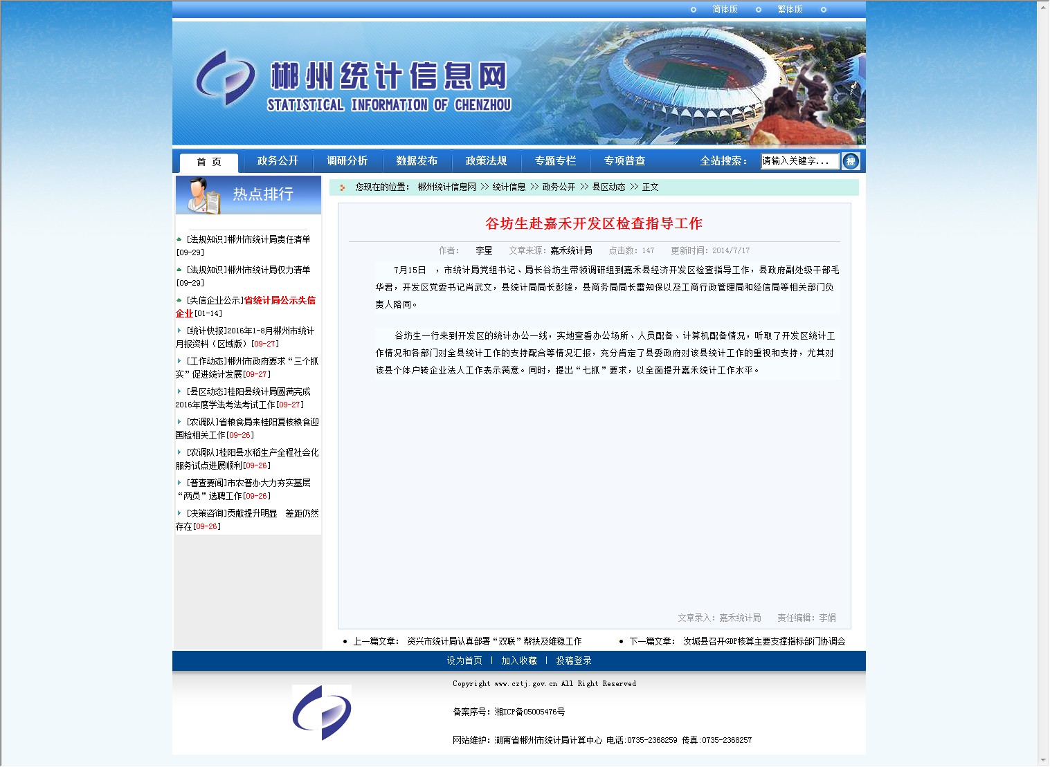 7月15日 ,市统计局党组书记、局长谷坊生带领调研组到嘉禾县经济开发区检查指导工作,县政府副处级干部毛华君,开发区党委书记肖武文,县统计局局长彭锋,县商务局局长雷知保以及工商行政管理局和经信局等相关部门负责人陪同。