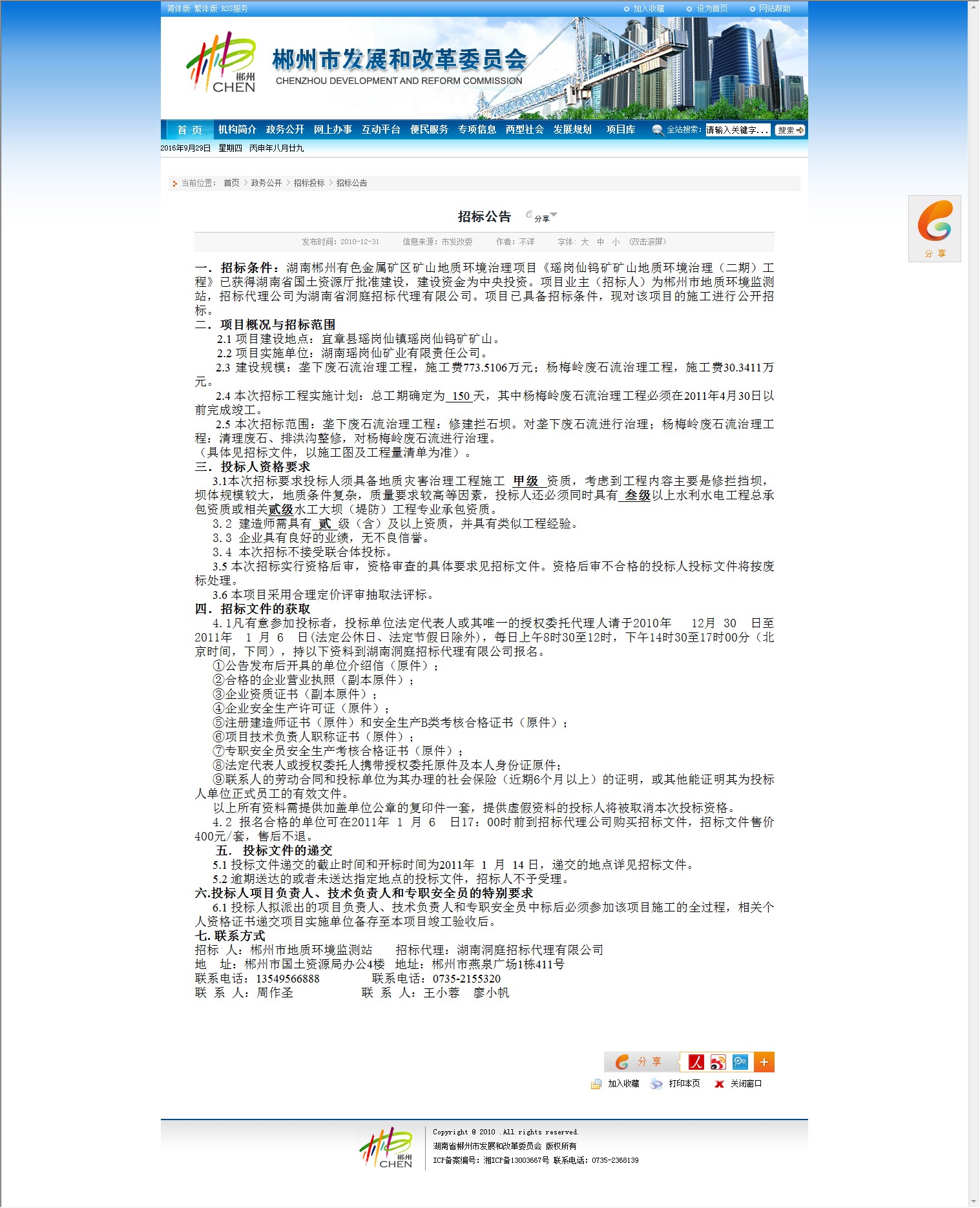 一.招标条件:湖南郴州有色金属矿区矿山地质环境治理项目《瑶岗仙钨矿矿山地质环境治理(二期)工程》已获得湖南省国土资源厅批准建设,建设资金为中央投资。项目业主(招标人)为郴州市地质环境监测站,招标代理公司为湖南省洞庭招标代理有限公司。项目已具备招标条件,现对该项目的施工进行公开招标。
