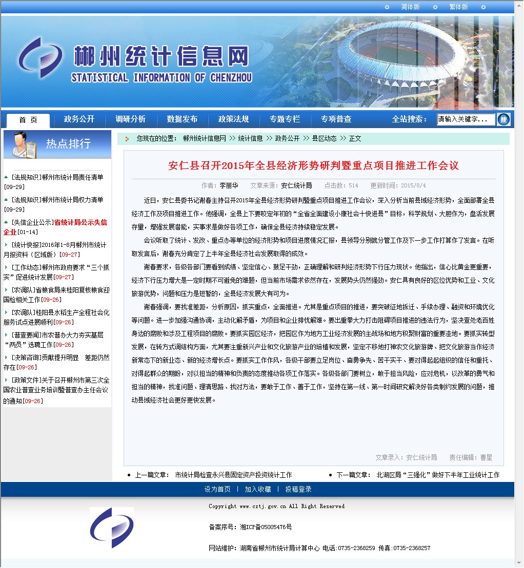 近日,安仁县委书记谢春主持召开2015年全县经济形势研判暨重点项目推进工作会议,深入分析当前县域经济形势,全面部署全县经济工作及项目推进工作。他强调,全县上下要咬定年初的“全省全面建设小康社会十快进县”目标,科学规划、大胆作为,盘活发展存量,增强发展潜能,实事求是做好各项工作,确保全县经济持续稳定发展。