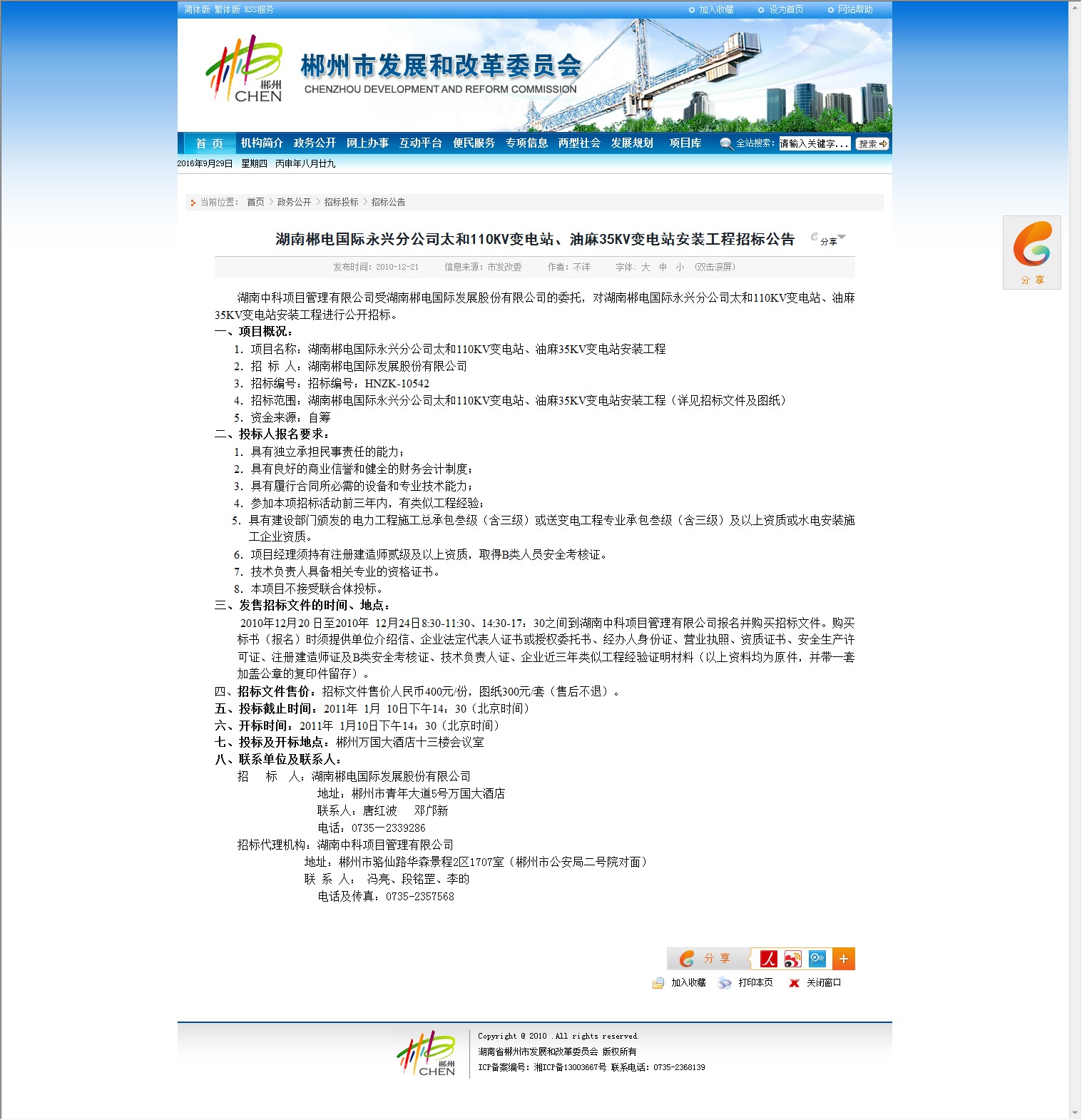 湖南中科项目管理有限公司受湖南郴电国际发展股份有限公司的委托,对湖南郴电国际永兴分公司太和110KV变电站、油麻35KV变电站安装工程进行公开招标。