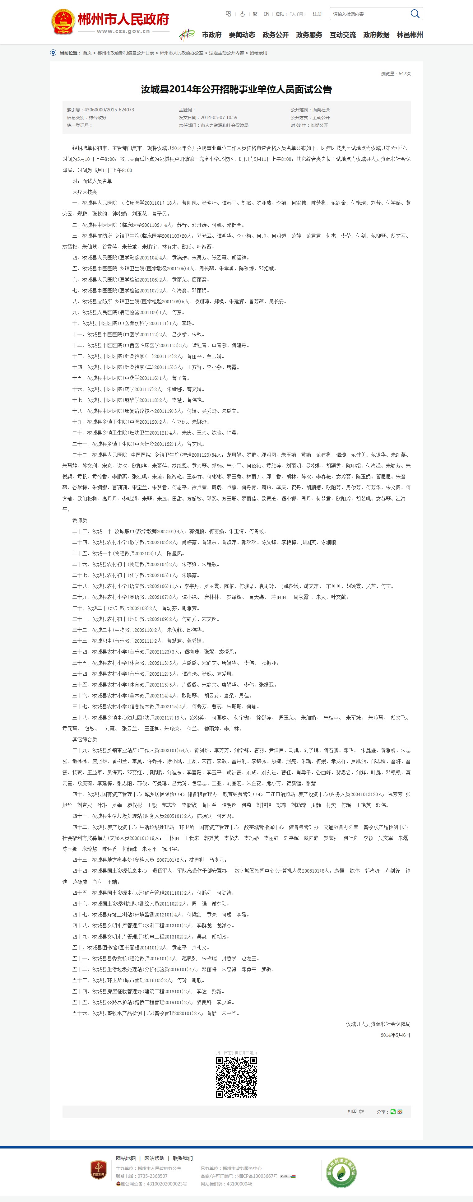 经招聘单位初审、主管部门复审,现将汝城县2014年公开招聘事业单位工作人员资格审查合格人员名单公布如下。医疗医技类面试地点为汝城县第六中学,时间为5月10日上午8:00;教师类面试地点为汝城县卢阳镇第一完全小学北校区,时间为5月11日上午8:00;其它综合类岗位面试地点为汝城县人力资源和社会保障局,时间为 5月11日上午8:00。