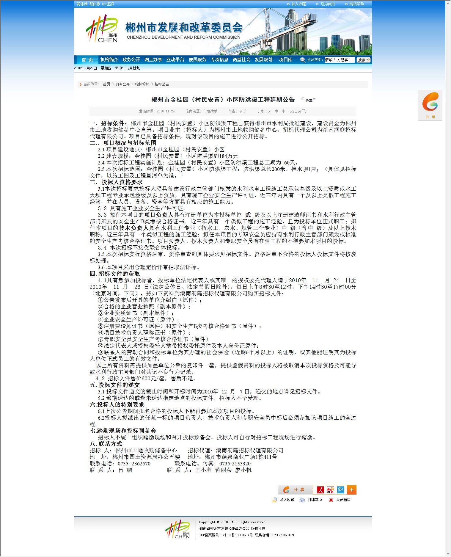 一、招标条件:郴州市金桂园(村民安置)小区防洪渠工程已获得郴州市水利局批准建设,建设资金为郴州市土地收购储备中心自筹。项目业主(招标人)为郴州市土地收购储备中心,招标代理公司为湖南洞庭招标代理有限公司。项目已具备招标条件,现对该项目的施工进行公开招标。