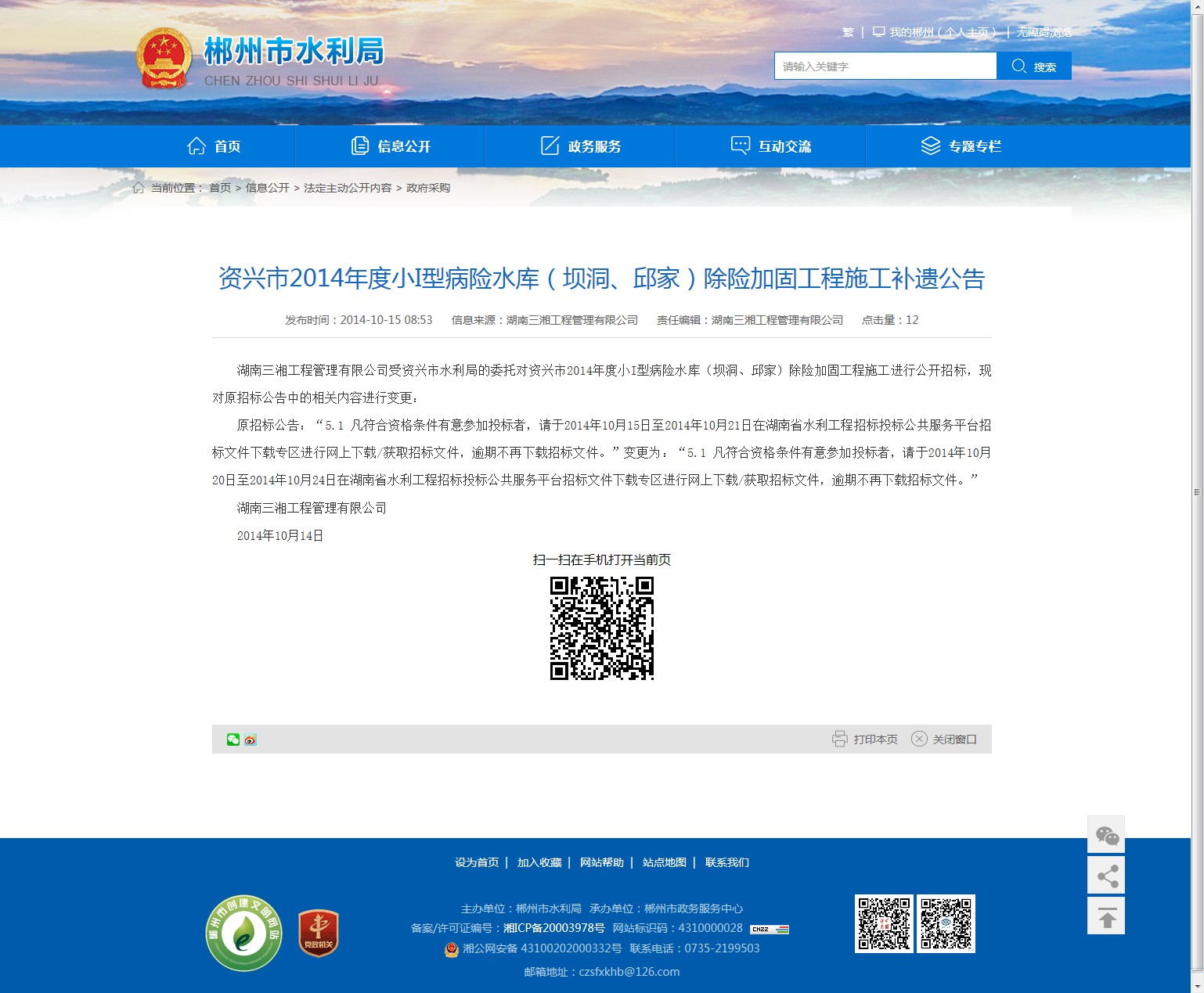湖南三湘工程管理有限公司受资兴市水利局的委托对资兴市2014年度小I型病险水库(坝洞、邱家)除险加固工程施工进行公开招标,现对原招标公告中的相关内容进行变更: