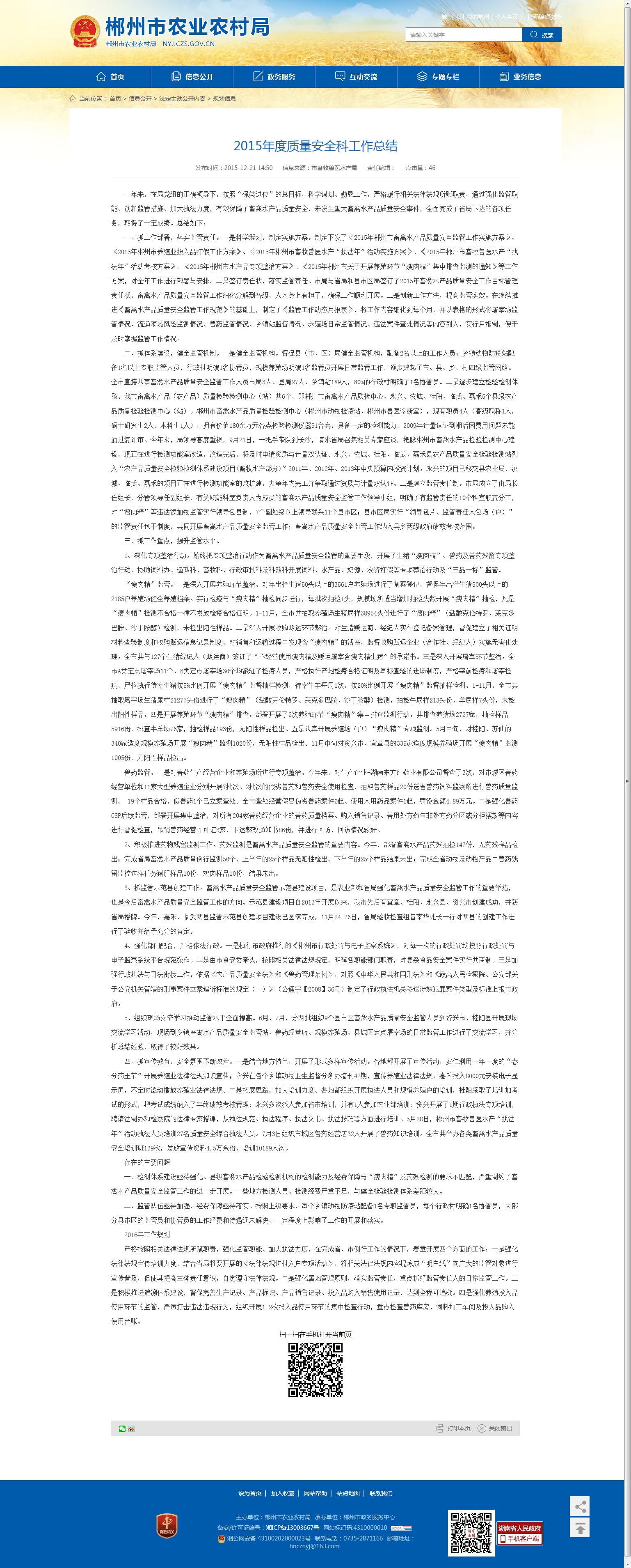 一、抓工作部署,落实监管责任。一是科学筹划,制定实施方案。制定下发了《2015年郴州市畜禽水产品质量安全监管工作实施方案》、《2015年郴州市养殖业投入品打假工作方案》、《2015年郴州市畜牧兽医水产“执法年”活动实施方案》、《2015年郴州市畜牧兽医水产“执法年”活动考核方案》、《2015年郴州市水产品专项整治方案》、《2015年郴州市关于开展养殖环节“瘦肉精”集中排查监测的通知》等工作方案,对全年工作进行部署与安排。二是签订责任状,落实监管责任。市局与省局和县市区局签订了2015年畜禽水产品质量安全工作目标管理责任状,畜禽水产品质量安全监管工作细化分解到各级,人人身上有担子,确保工作顺利开展。三是创新工作方法,提高监管实效。在继续推进《畜禽水产品质量安全监管工作规范》的基础上,制定了《监管工作动态月报表》,将工作内容细化到每个月,并以表格的形式将屠宰场监管情况、流通领域风险监测情况、兽药监管情况、乡镇站监督情况、养殖场日常监管情况、违法案件查处情况等内容列入,实行月报制,便于及时掌握监管工作情况。