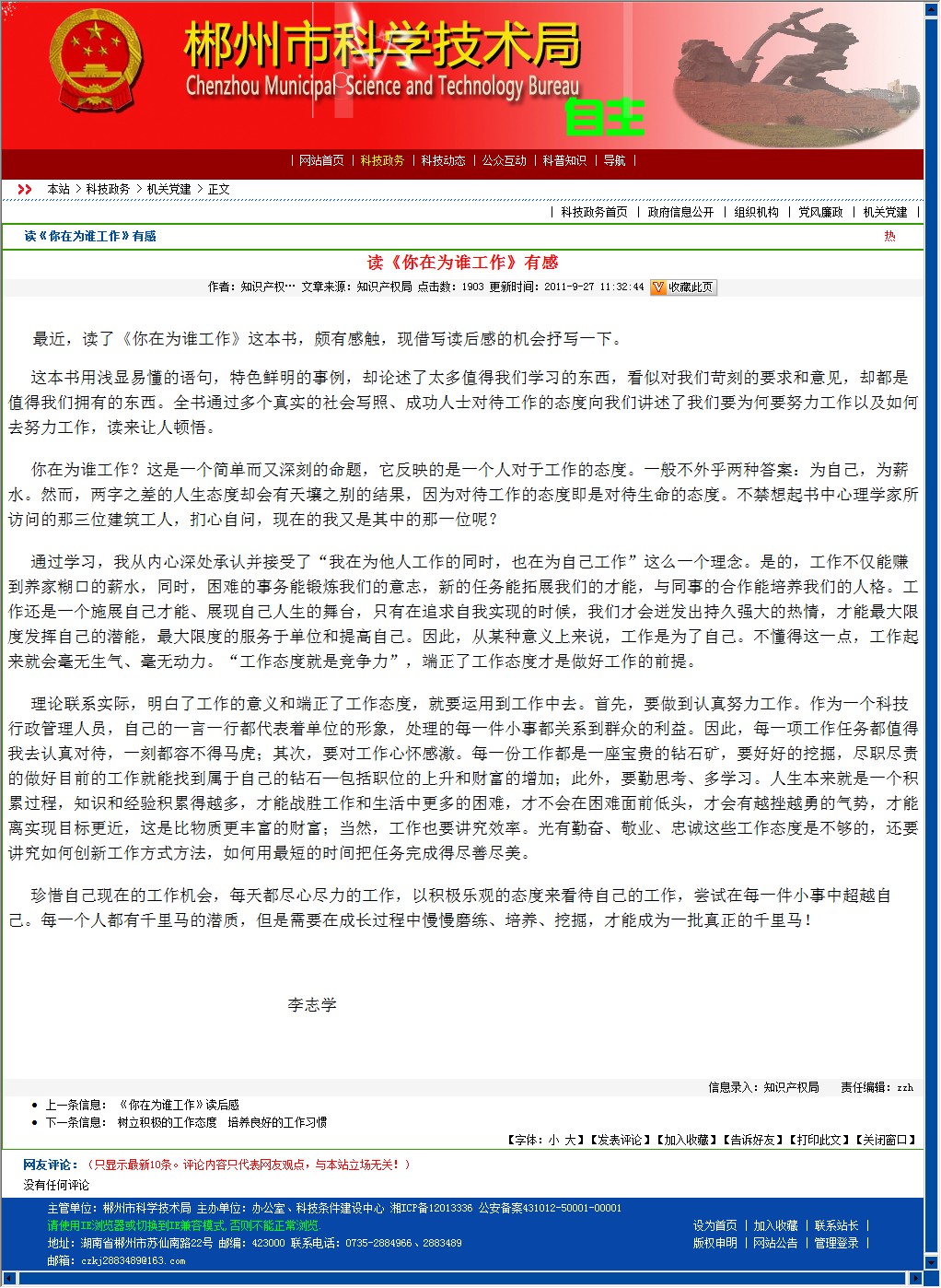 理论联系实际,明白了工作的意义和端正了工作态度,就要运用到工作中去。首先,要做到认真努力工作。作为一个科技行政管理人员,自己的一言一行都代表着单位的形象,处理的每一件小事都关系到群众的利益。因此,每一项工作任务都值得我去认真对待,一刻都容不得马虎;其次,要对工作心怀感激。每一份工作都是一座宝贵的钻石矿,要好好的挖掘,尽职尽责的做好目前的工作就能找到属于自己的钻石—包括职位的上升和财富的增加;此外,要勤思考、多学习。人生本来就是一个积累过程,知识和经验积累得越多,才能战胜工作和生活中更多的困难,才不会在困难面前低头,才会有越挫越勇的气势,才能离实现目标更近,这是比物质更丰富的财富;当然,工作也要讲究效率。光有勤奋、敬业、忠诚这些工作态度是不够的,还要讲究如何创新工作方式方法,如何用最短的时间把任务完成得尽善尽美。