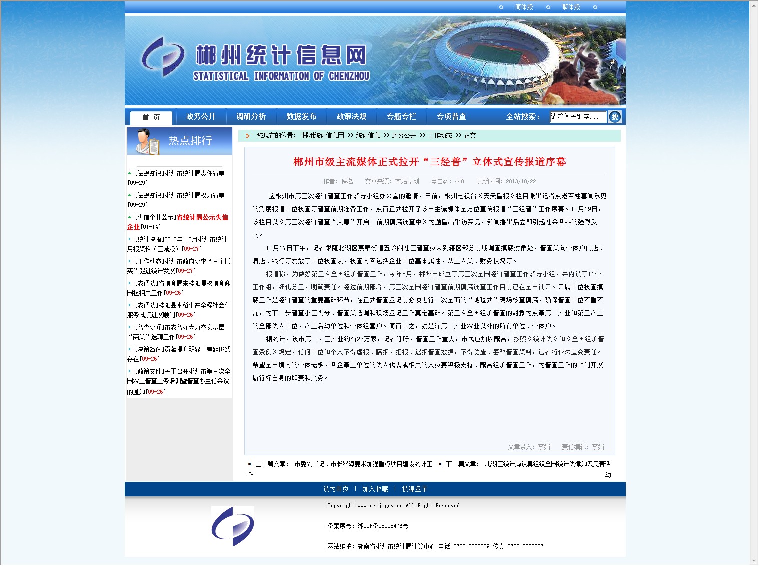 应郴州市第三次经济普查工作领导小组办公室的邀请,日前,郴州电视台《天天播报》栏目派出记者从老百姓喜闻乐见的角度报道单位核查等普查前期准备工作,从而正式拉开了该市主流媒体全方位宣传报道“三经普”工作序幕。
