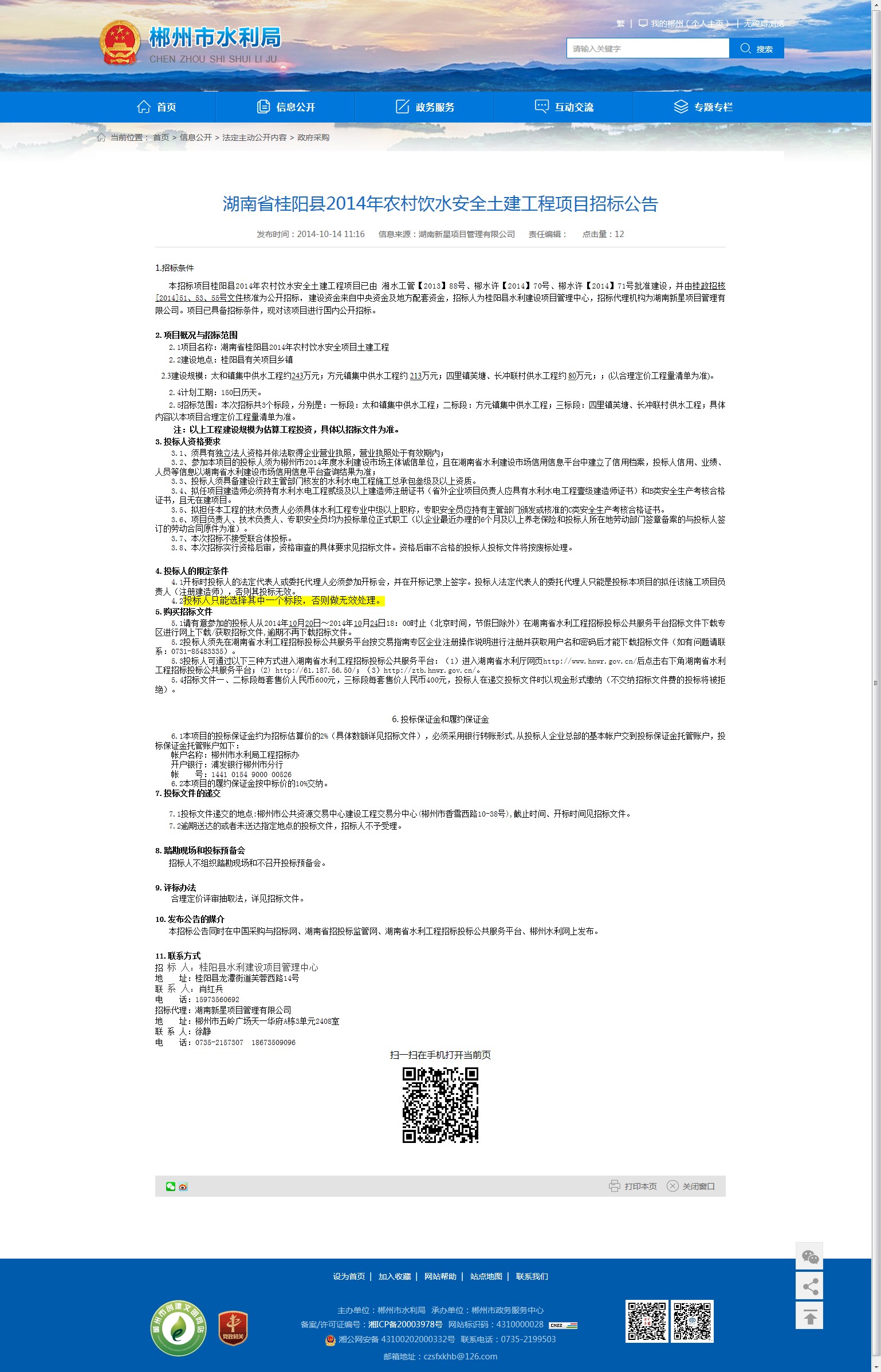 3.2、参加本项目的投标人须为郴州市2014年度水利建设市场主体诚信单位,且在湖南省水利建设市场信用信息平台中建立了信用档案,投标人信用、业绩、人员等信息以湖南省水利建设市场信用信息平台查询结果为准;